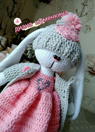 вязаная зайка тильда.очаровательна.связана из хлопка.обладает длинными ушами,красивой шарочкой с помпоном и платьем с кардиганом.снимается кардиган и шапка... если сделать платье сьемное +100р.