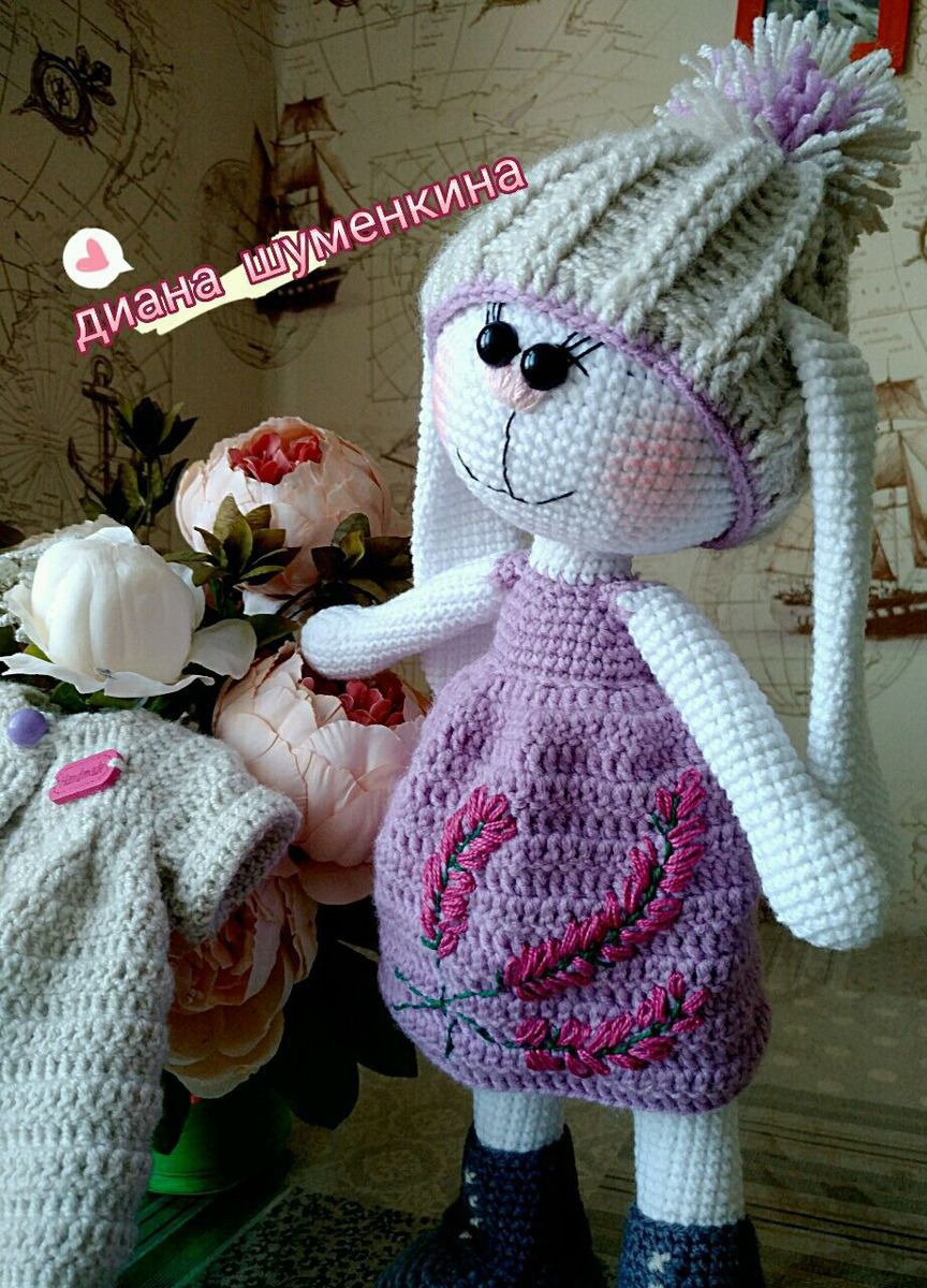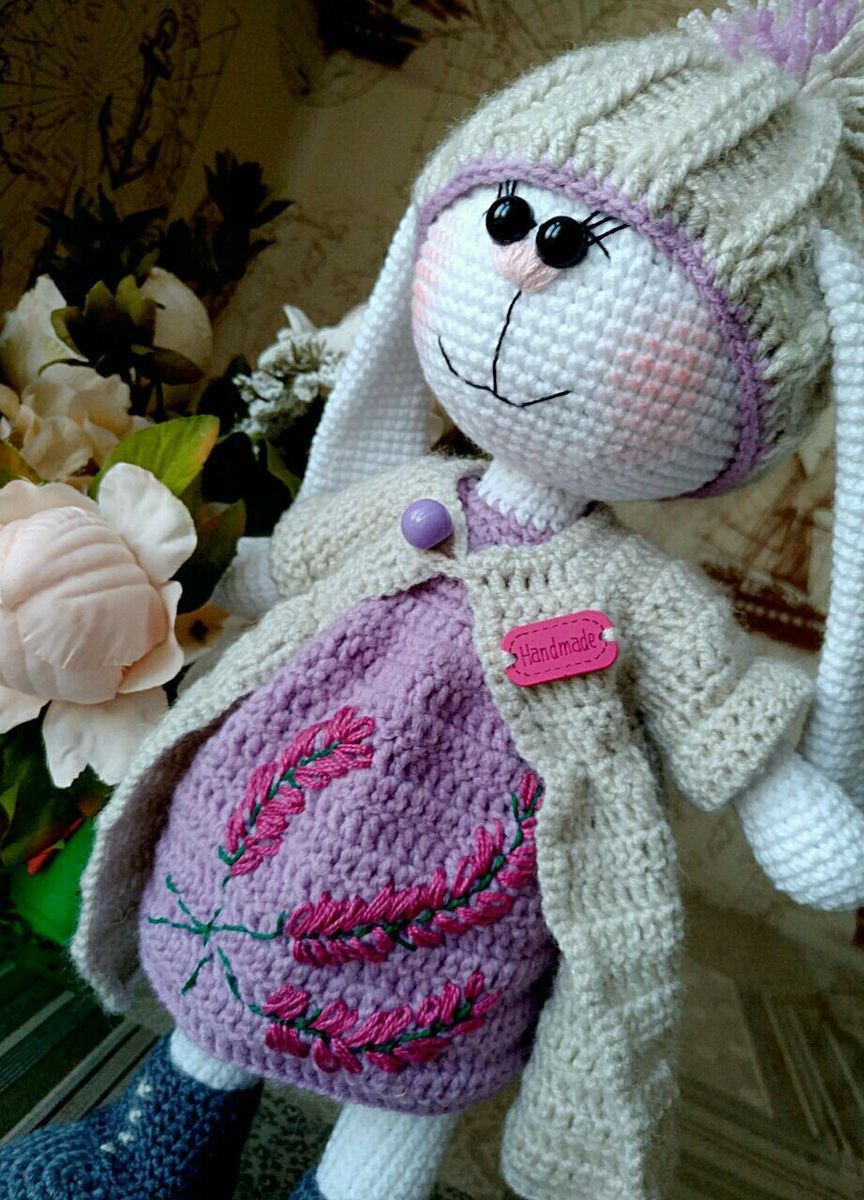 вязаная зайка Джульетта.высокая 34-35см.связана из хлопка..одежда из полушерсти.