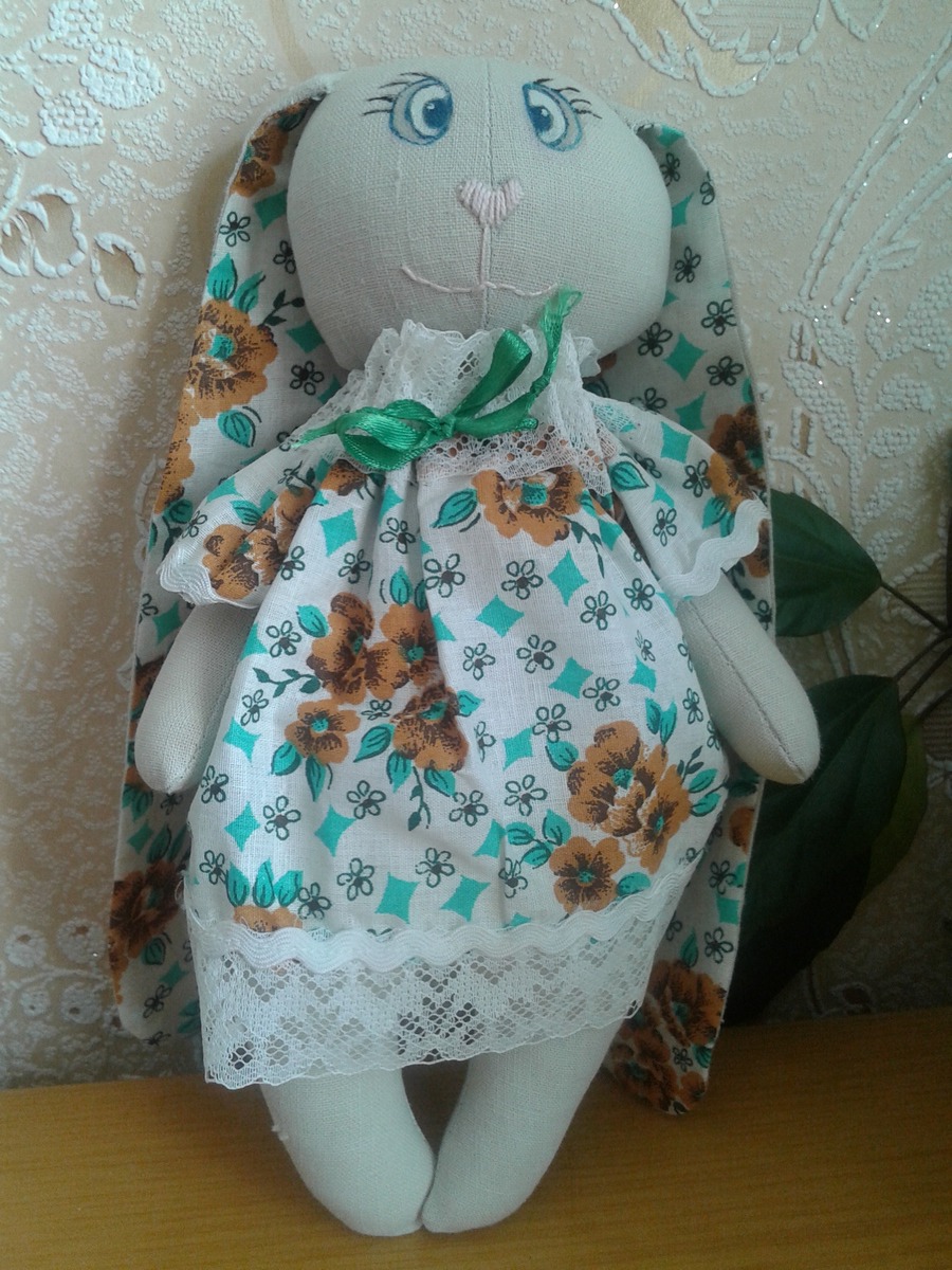 Зайка-девочка в светло-зеленом платье ручной работы, высота 25 см., выполнена с любовью изо льна, платьице из ситца, обшитое кружевом, присборенное атласной лентой, можно снимать. Дети любят укладывать спать и рассказать своей любимой игрушке сказки и стихи.