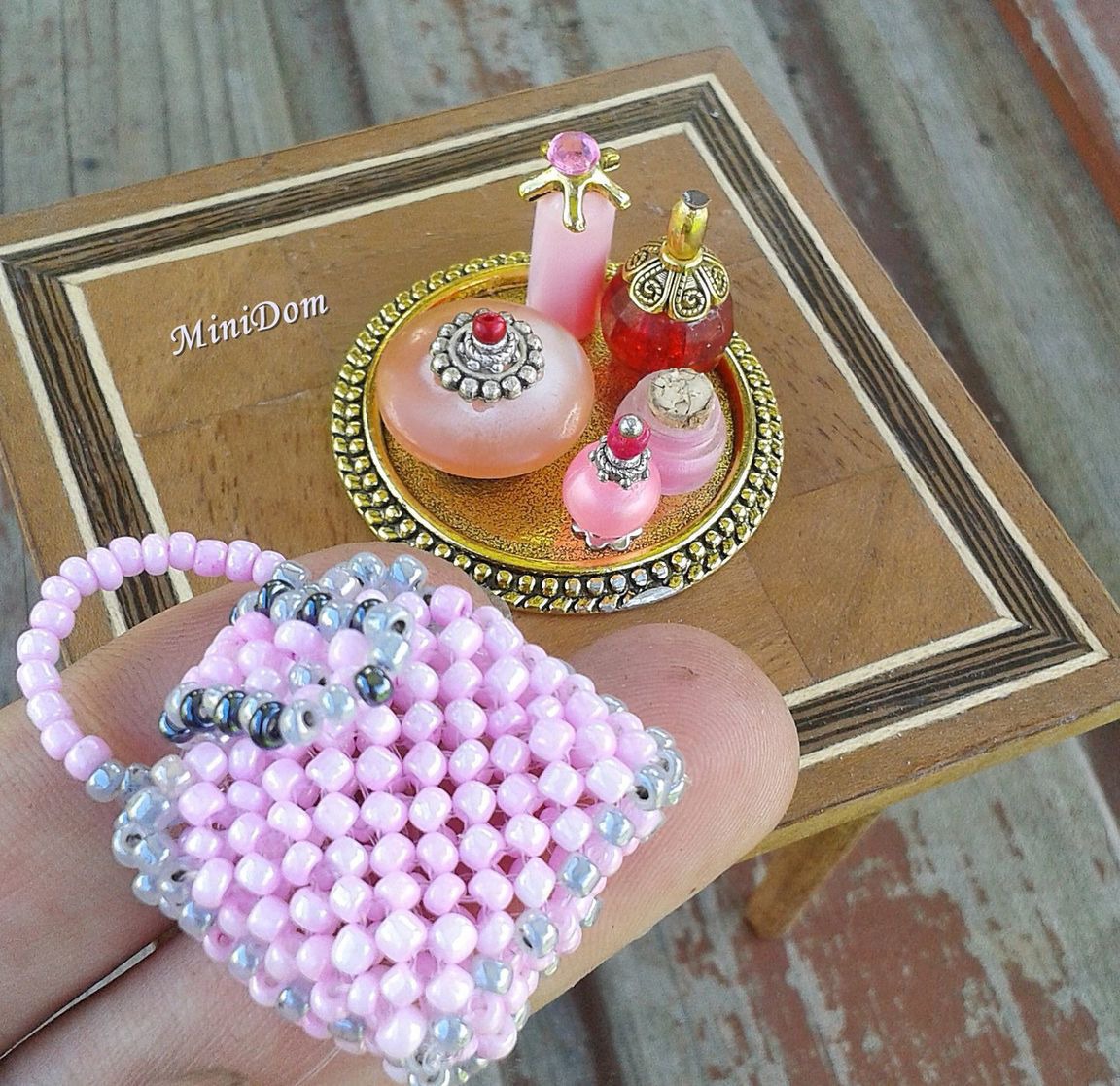 Использовать такую кукольную миниатюру можно как в кукольном доме, так и для фотосессий ваших кукол и игрушек. На четвертом и пятом фото представлены варианты сочетания подноса флакончиками с подходящей по цвету бисерной сумочкой - цена одной сумочки 500 рублей.