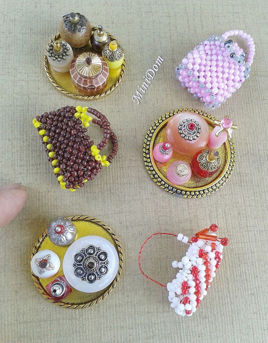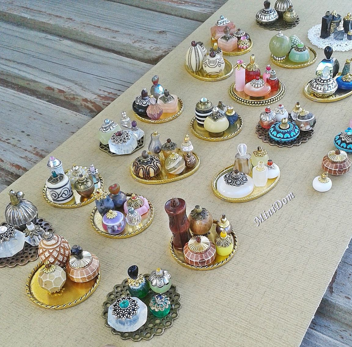 Флаконы для кукольного дома выполнены из различных бусин - натуральных камней, акриловых бусин, металлической фурнитуры. Это полностью ручная работа, флаконы собраны в комплекты по цветам, установлены на различные металлические подносики.
