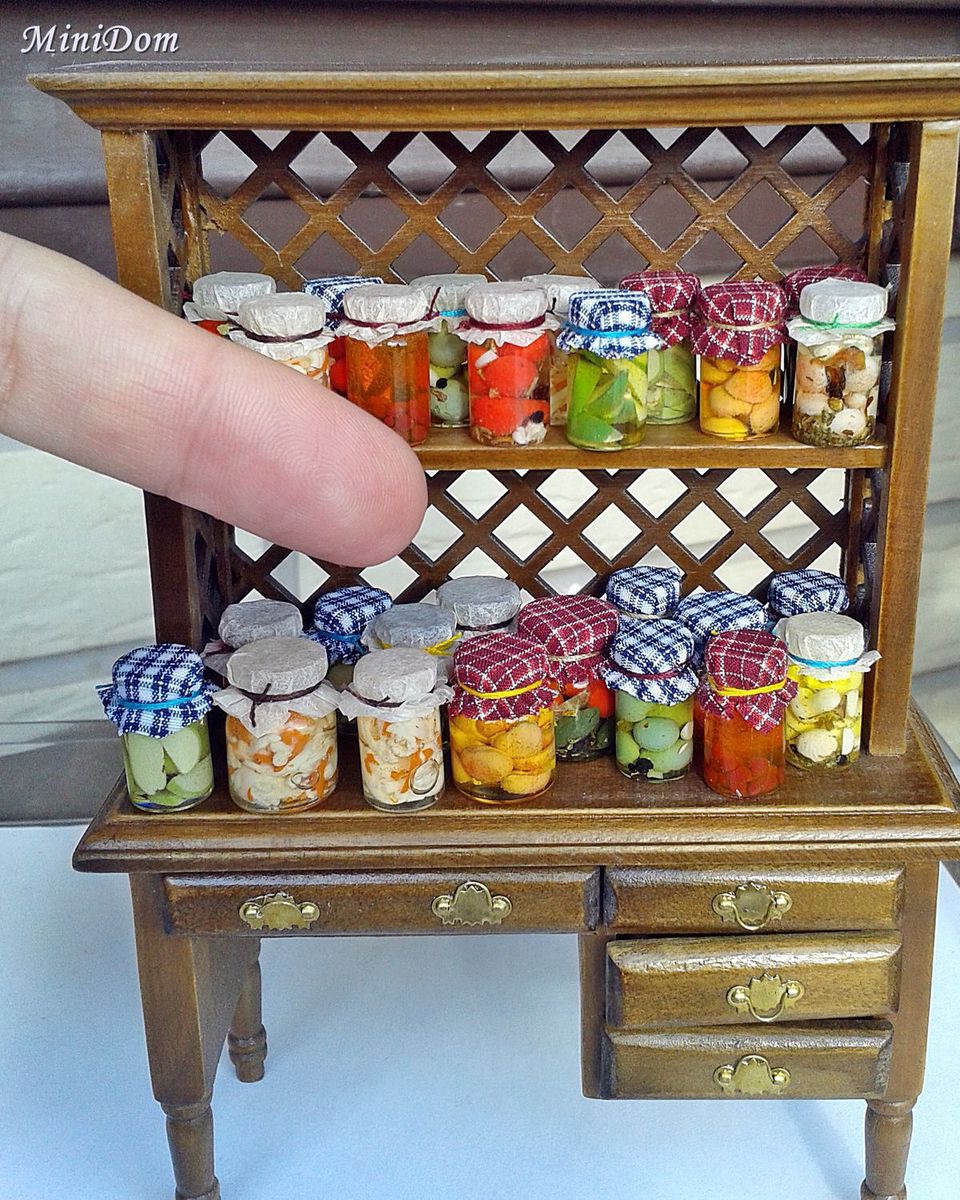 Эта кукольная миниатюра сделана в масштабе 1 к 12. Это полностью ручная работа. Все овощи слеплены вручную, капуста нарублена, добавлены специи, чеснок, перец и все залито рассолом из ювелирной смолы. Сверху баночки закрыты либо тряпочкой в очень мелкую клетку, либо вощеной бумагой.