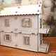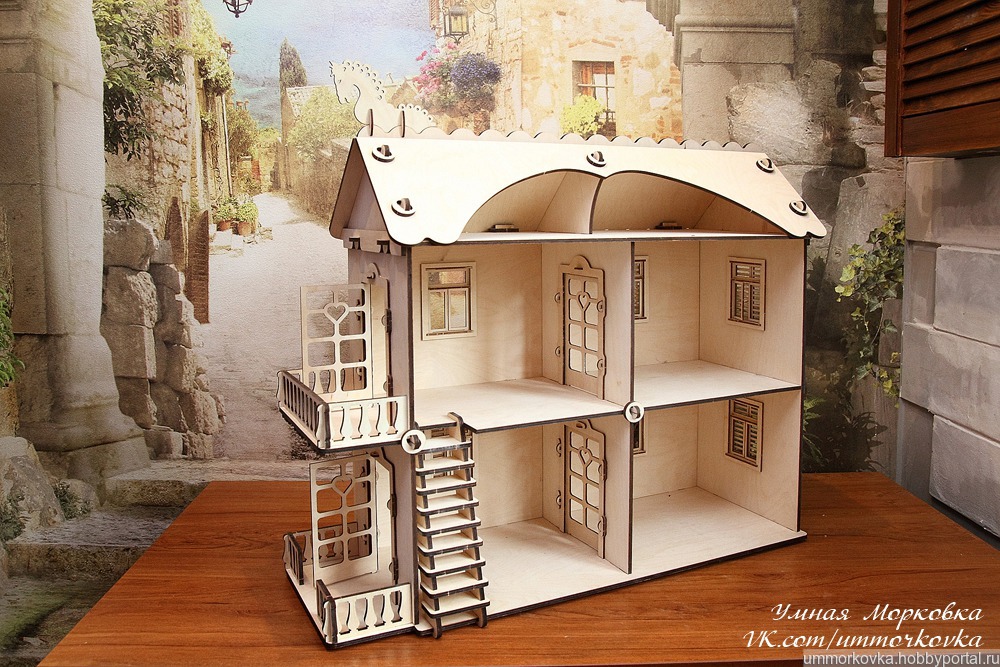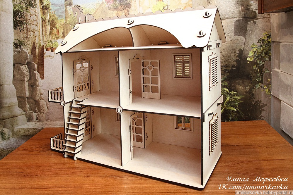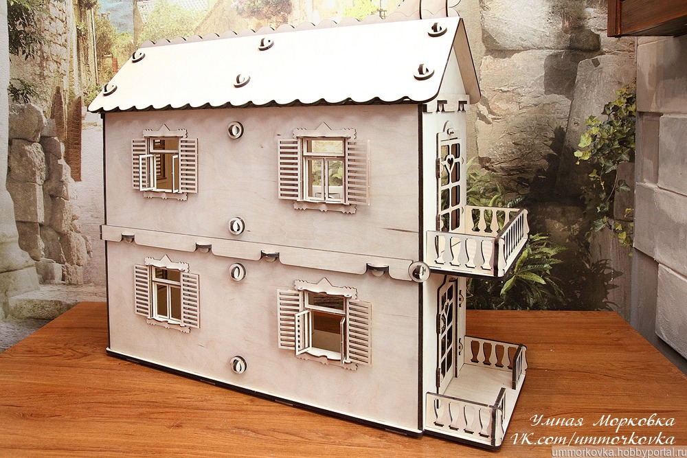 Домик состоит из 4 комнат и небольшого чердака. 6 окон имеют открывающиеся створки и ставкни, 4 двери, крыльцо и один балкон. Выпускается в виде сборного комплекта из фанеры 6мм (окна и двери - 3мм). Метод изготовления: лазерная резка с последующим зашкуриванием (без зашкуривания стоимость 7500р). Рекомендуется последующая покраска или покрытие бесцветным лаком.
