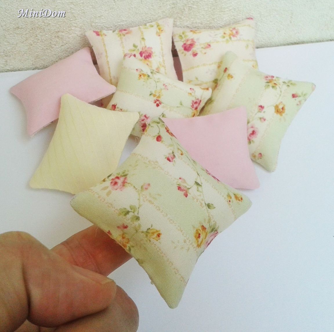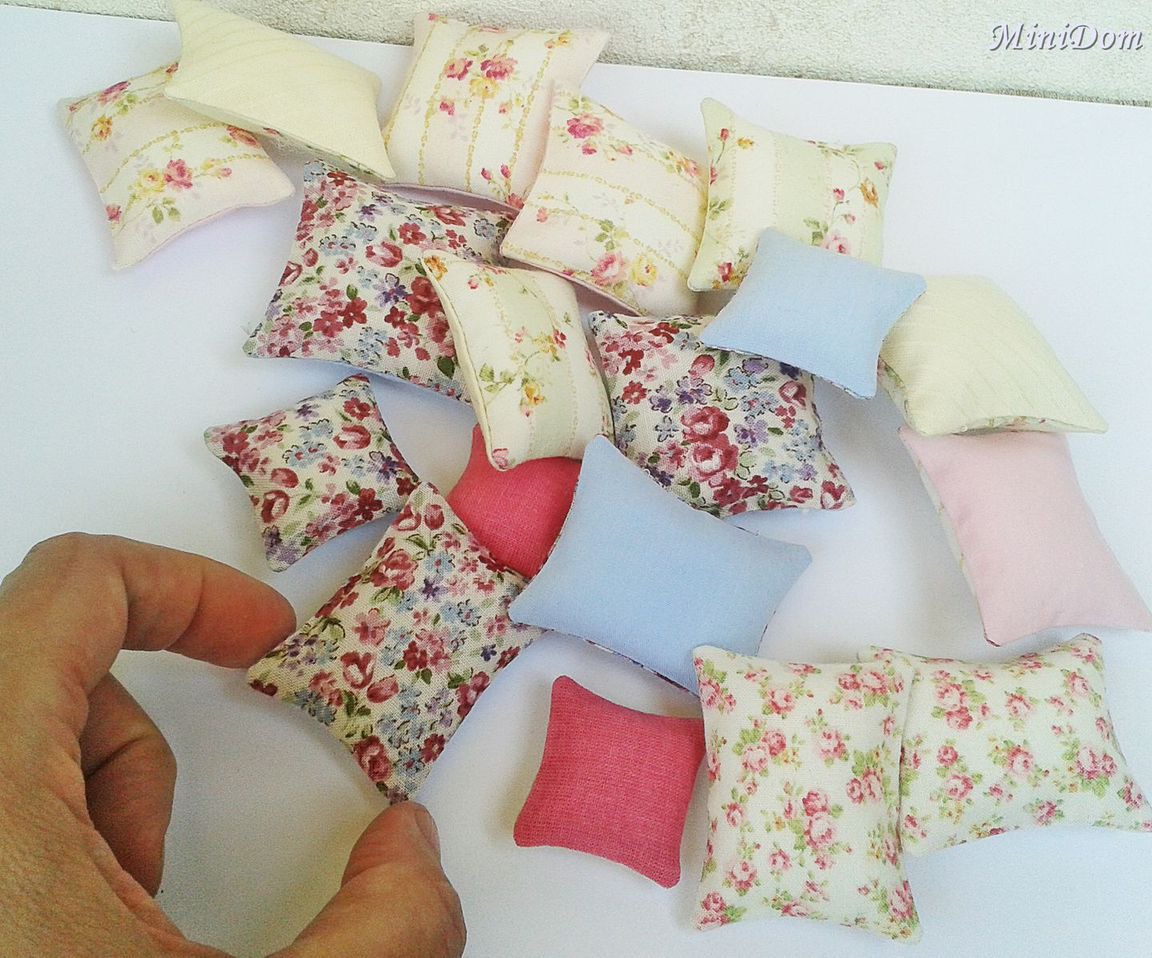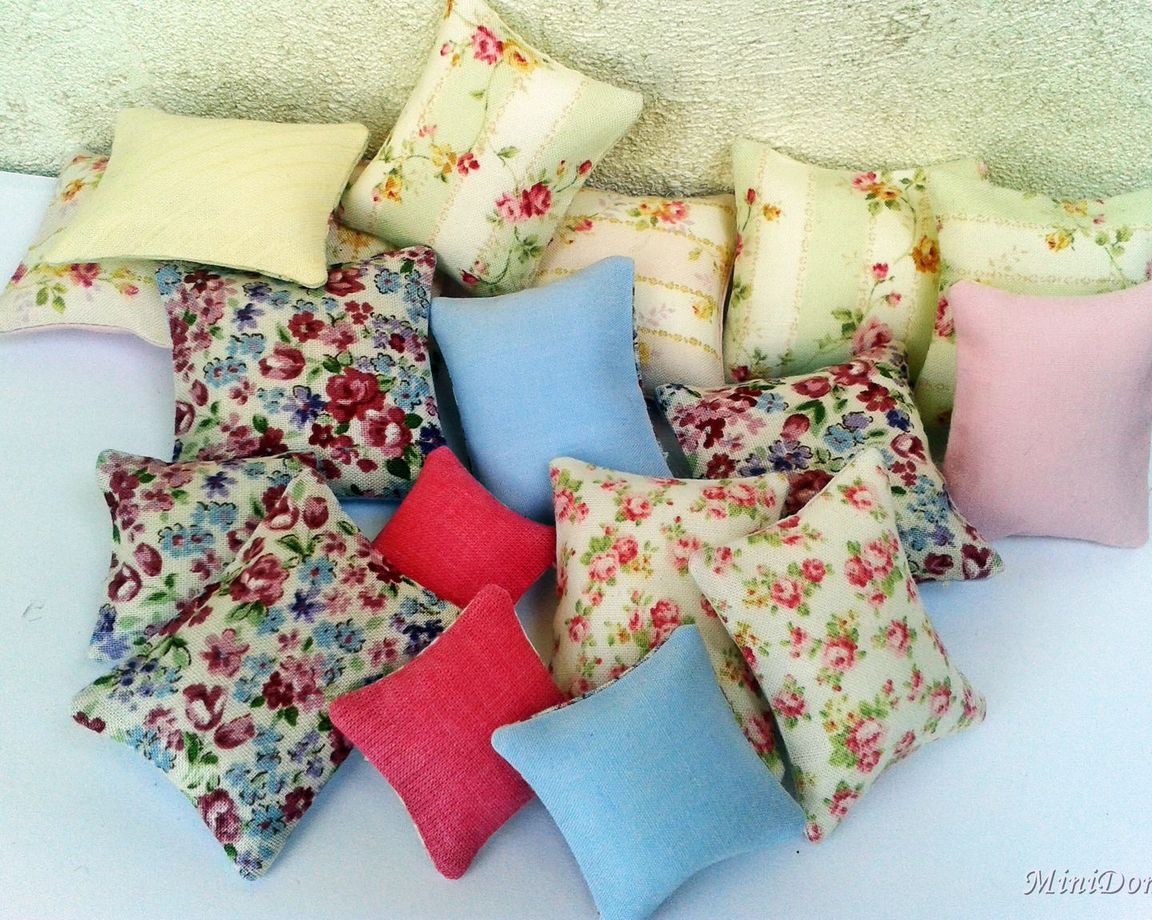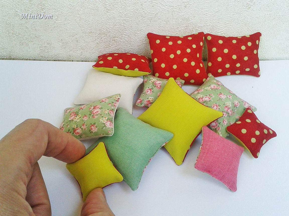 Аксессуары для кукольного домика - Подушки для кукол разного цвета и размера выполнены из 100% хлопка, набиты искусственным лебяжьим пухом. Это полностью ручная работа, практически все подушки сделаны двусторонними, т.е. они подойдут к самым разным кукольным интерьерам - от стиля кантри или Прованс до деревенского стиля.