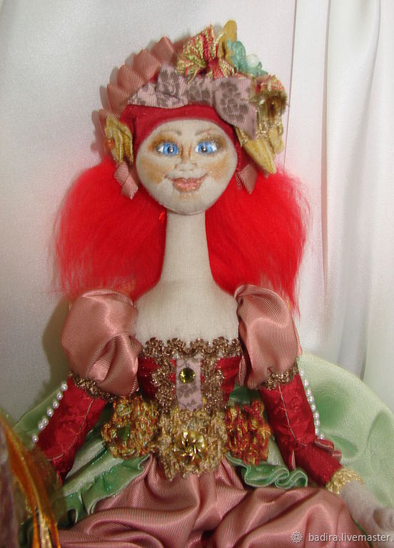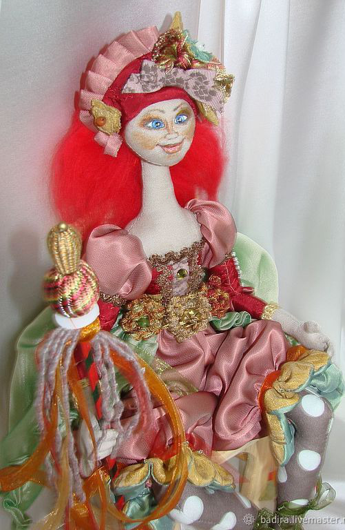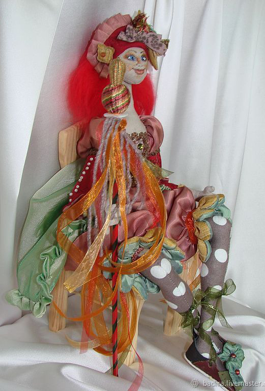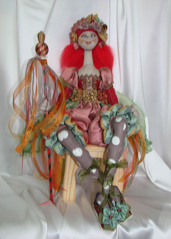 Создана по мотивам фантазийных кукол Патти Медарис Кулеа. Очень позитивная куколка! Множеством деталей она долго будет приковывать ваш взгляд к себе! За счет проволочного каркаса в ладонях держит посох сама. Ноги и руки на пуговичном креплении, может сидеть в любой позе.