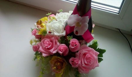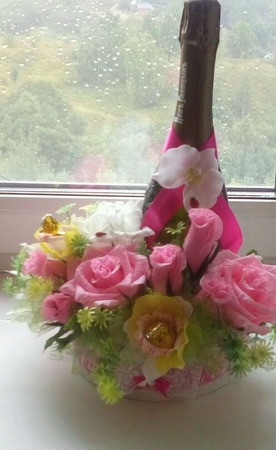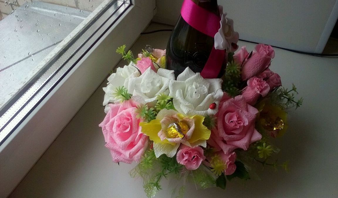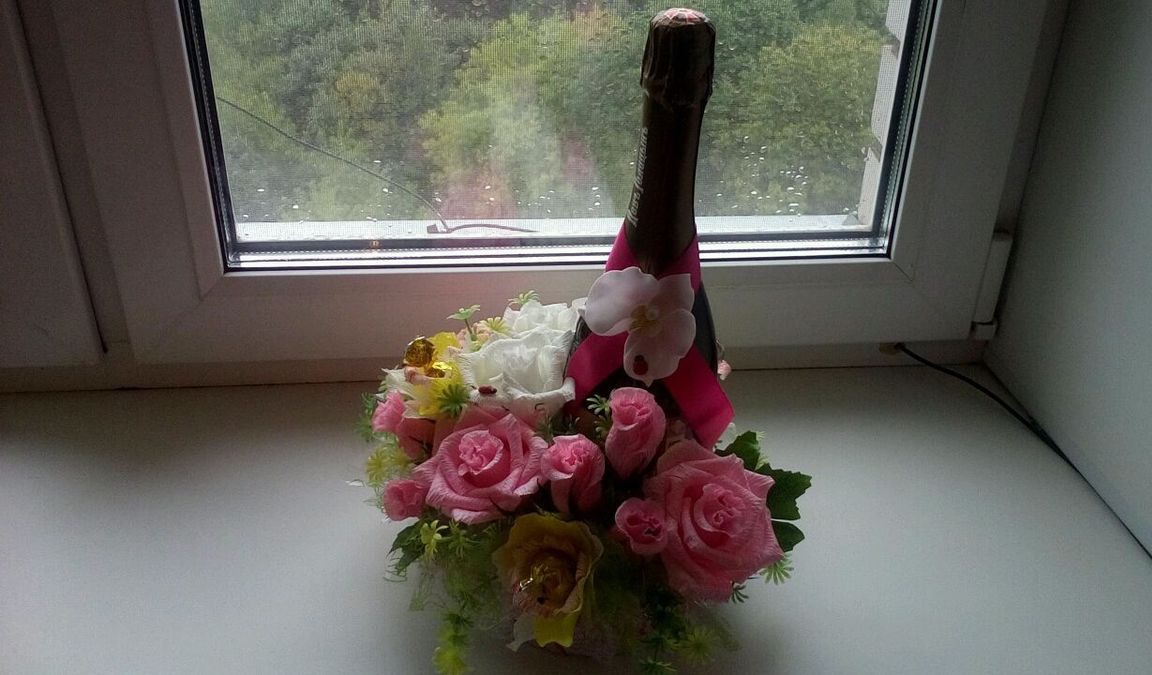 Цена указана без стоимсти шампанского, только композиция из цветов с конфетами на подставке для шампанского и съемное украшение.