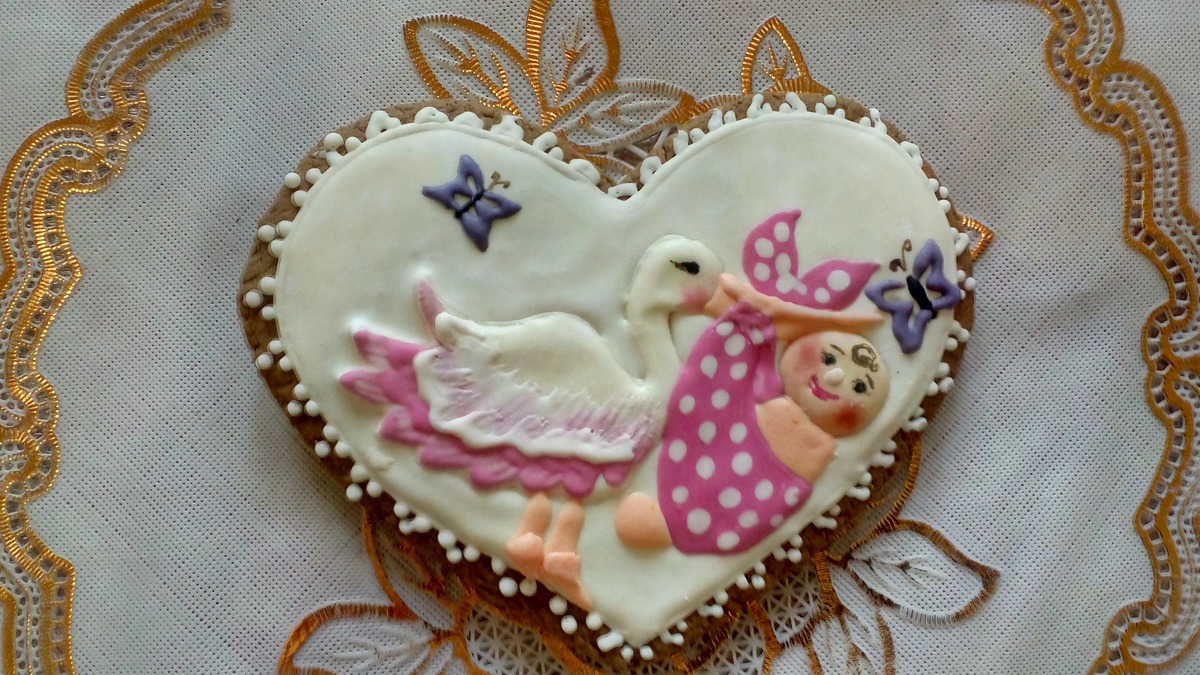 Расписной имбирный пряник. Подойдёт для поздравления с рождением ребеночка. Возможно выполнение в голубом цвете.