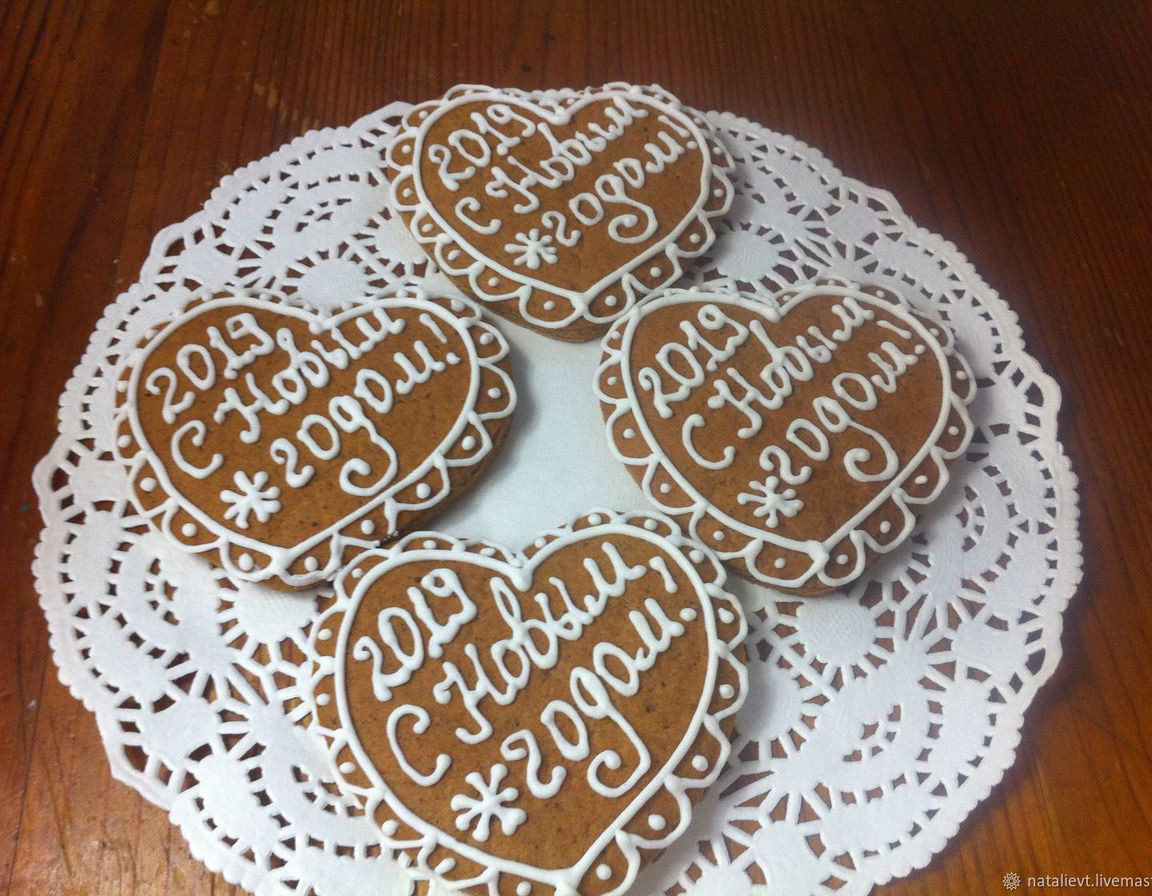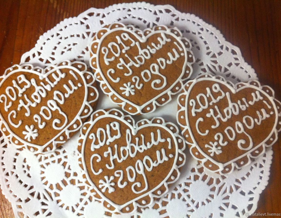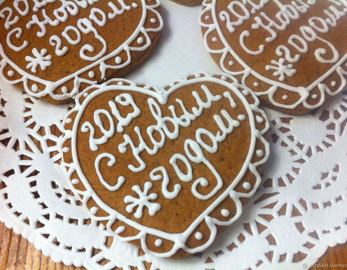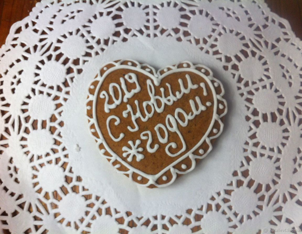 Нарядный расписной пряник-сердечко с Новогодней надписью - отличный сувенир для всех, кого вы хотите поздравить с Новый годом. Может быть использован как самостоятельный сувенир или как часть подарочного набора.