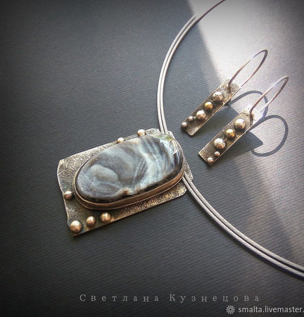 Колье с подвеской из серебра с другой серого агата. Колье на ювелирной струне. Серебро покрыто патиной под защитой воска.