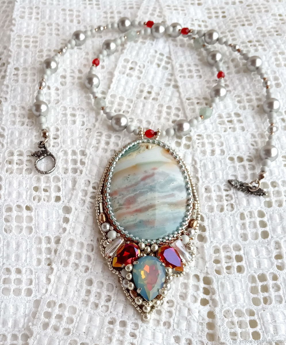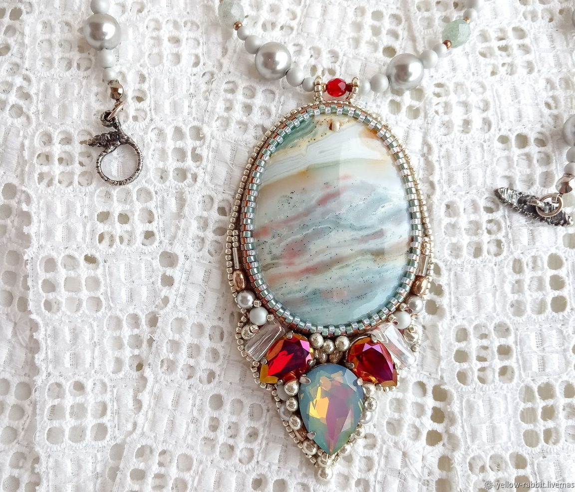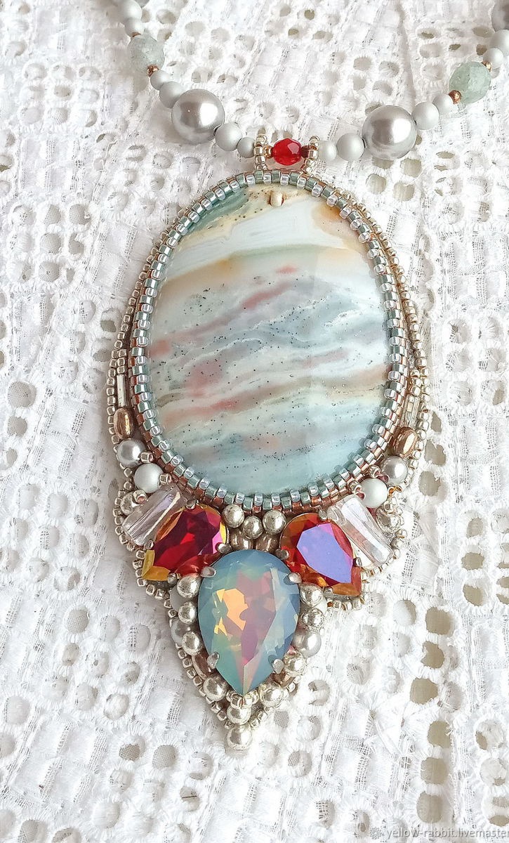 мятный, украшения ручной работы, кулон ручной работы, свадебные украшения, украшения из бисера, украшения с камнями, украшения с жемчугом, украшения на шею, нежные украшения, украшения из натуральных камней, вышитые украшения, кулон со стразами, кулон сваровски, украшения с океанической яшмой, авторские украшения с натуральными камнями