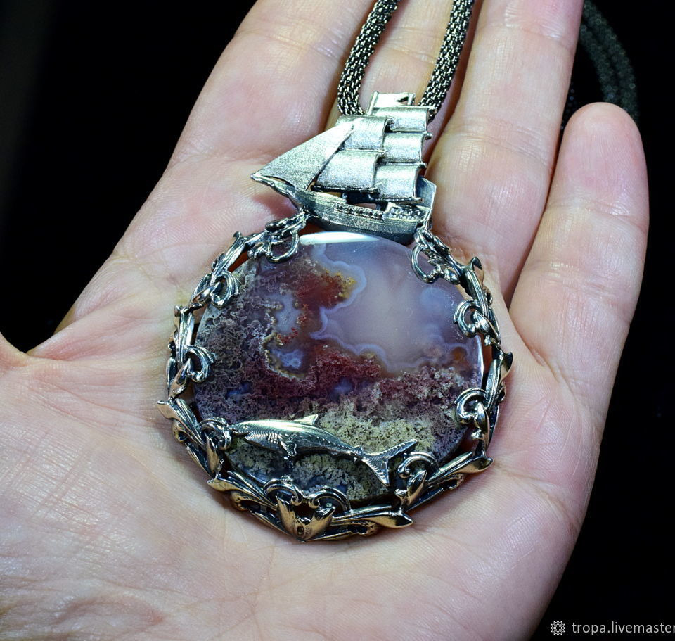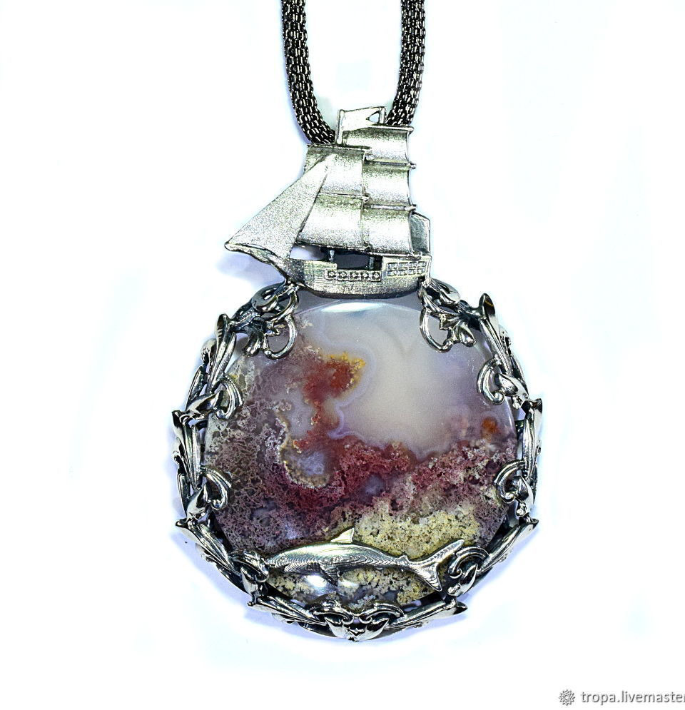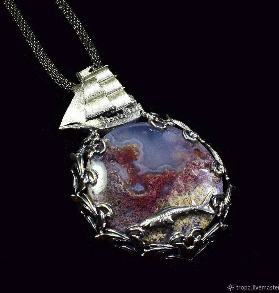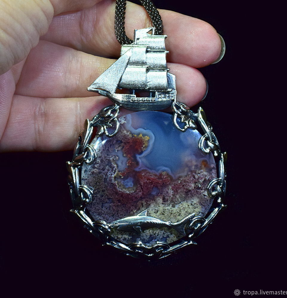 море, остров, корабль, подарок девушке, подарок женщине, кулон, серебряный, серебро 925 пробы, крупный кулон, парусник, серебряный кулон, морское путешествие, дендроагат, кулон с дендроагатом, моховой агат, моховой агат кулон, кулон с парусником, кулон с акулой, призрачный остров, море призраков