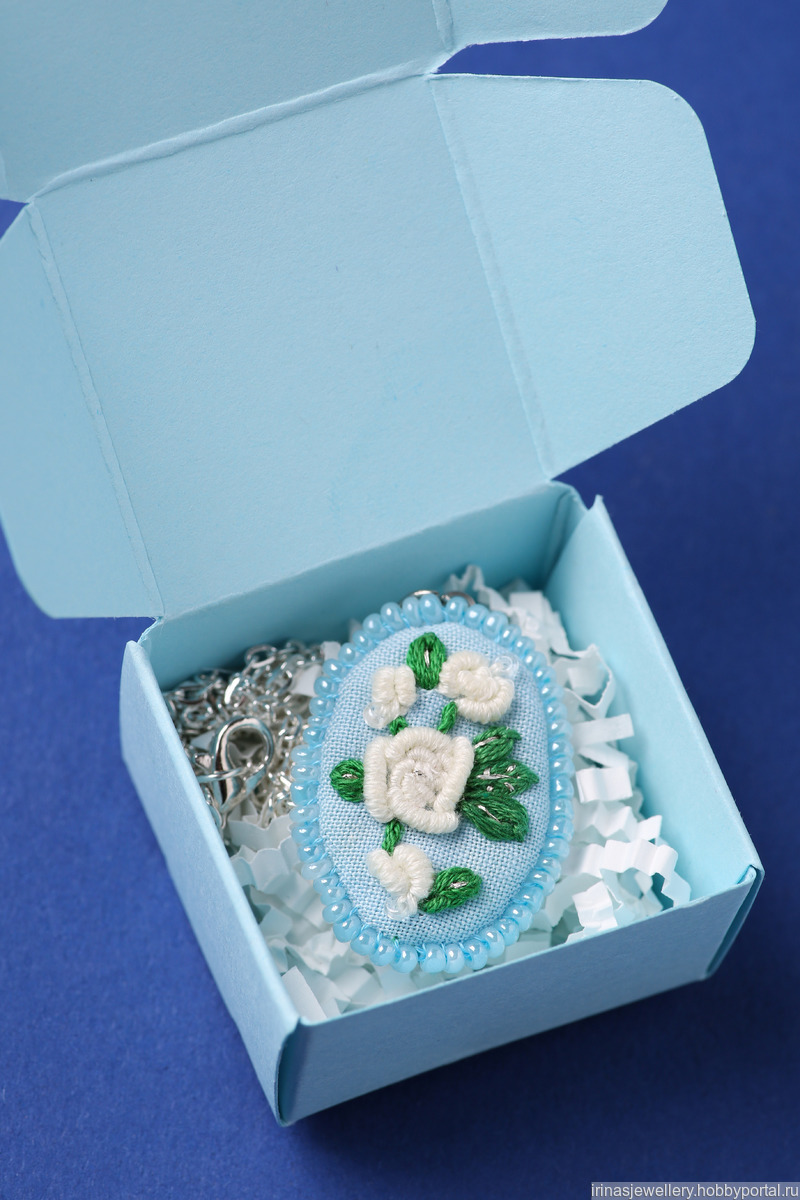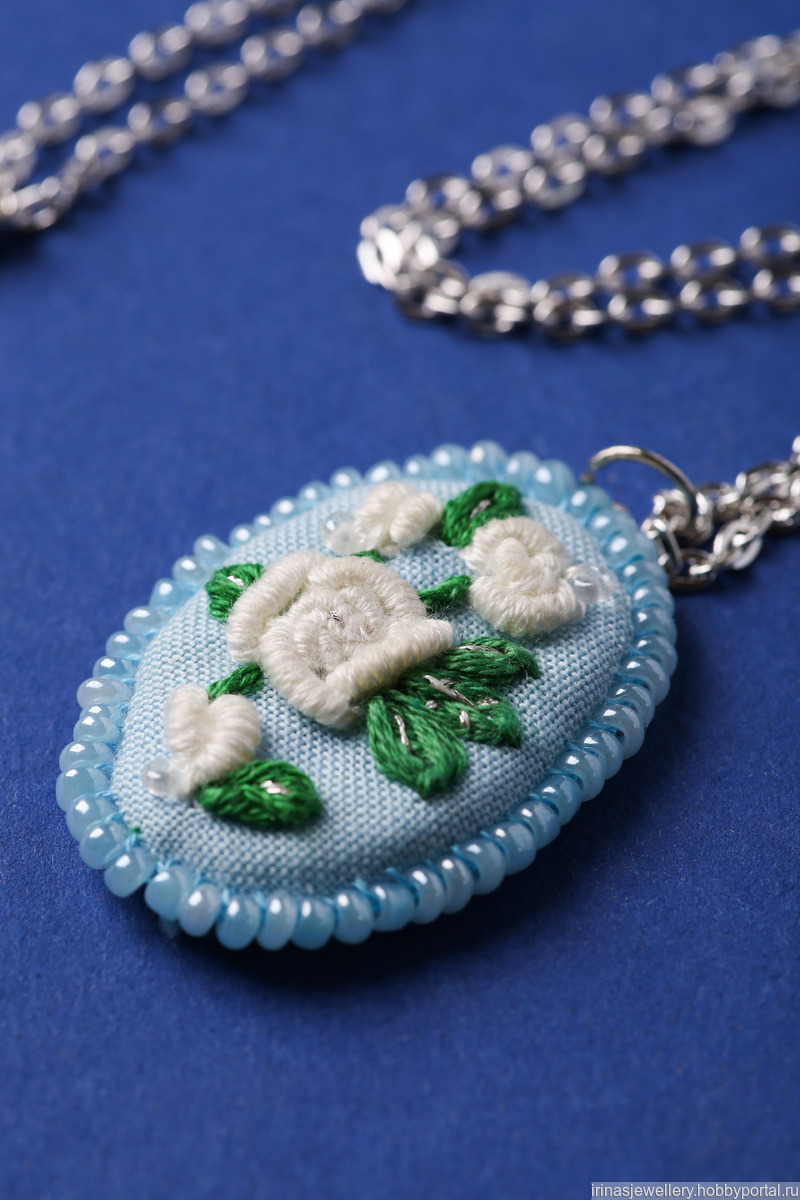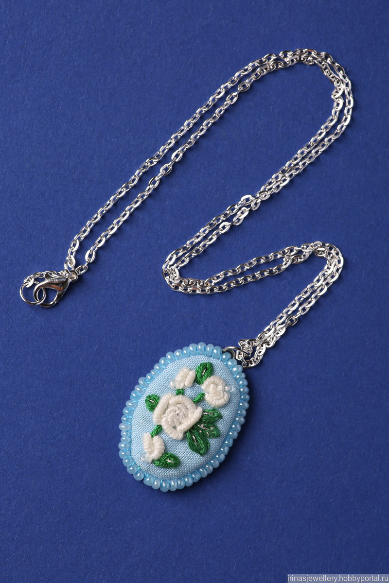 Очень красивый кулон с ручной вышивкой в стиле Рококо. Очень нежный кулон с белыми розами на голубом фоне. Ручная вышивка нитками мулине на хлопке в обрамлении чешского бисера. Продается вместе с цепочкой 50 см. и в красивой подарочной коробочке.