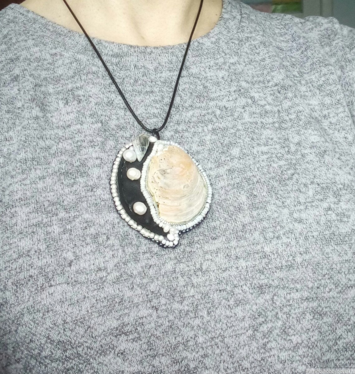 Кулон "день и ночь" в стиле бохо. Материалы: нат. кожа, культивированный жемчуг, речной жемчуг, раковина Устрицы, вощеная тесьма.