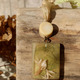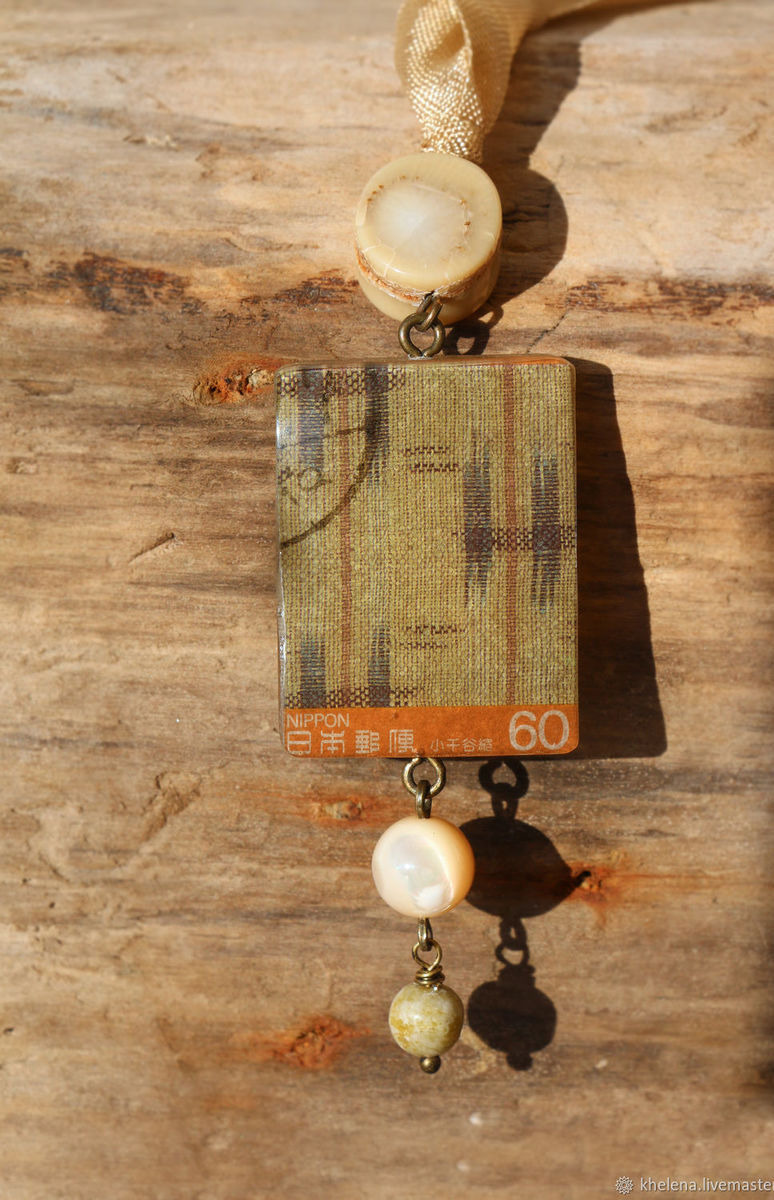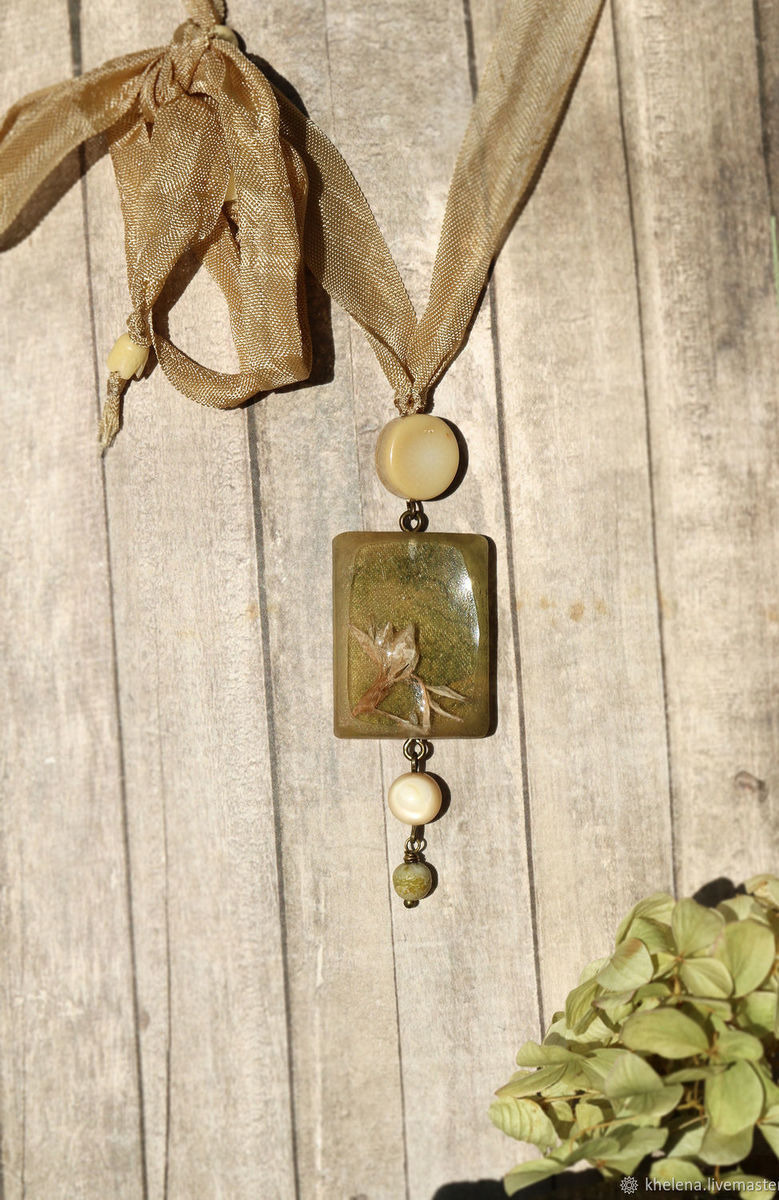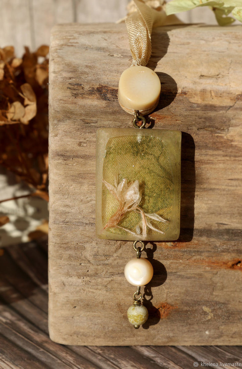 Нежный двухсторонний кулон из сухоцвета в эпоксидной смоле на подложке из винтажного шелка и старой японской марки. Края композиции матированы и тонированы золотистым акрилом. Поверхность эпоксидного «окошка» не идеально глянцевая – в легких муаровых разводах. Этот элемент дополнен бусинами из коралла, перламутра и змеевика и подвешен на длинную шелковую ленту. Украшение надевается через голову и утягивается через бусинку из кости. Концы ленты также декорированы винтажной костью, что позволяет носить кулон не только бантиком сзади, но и перекидывать свободные концы ленты вперед, завязывать ее сбоку, сместив бусину-стопор, менять варианты по настроению.