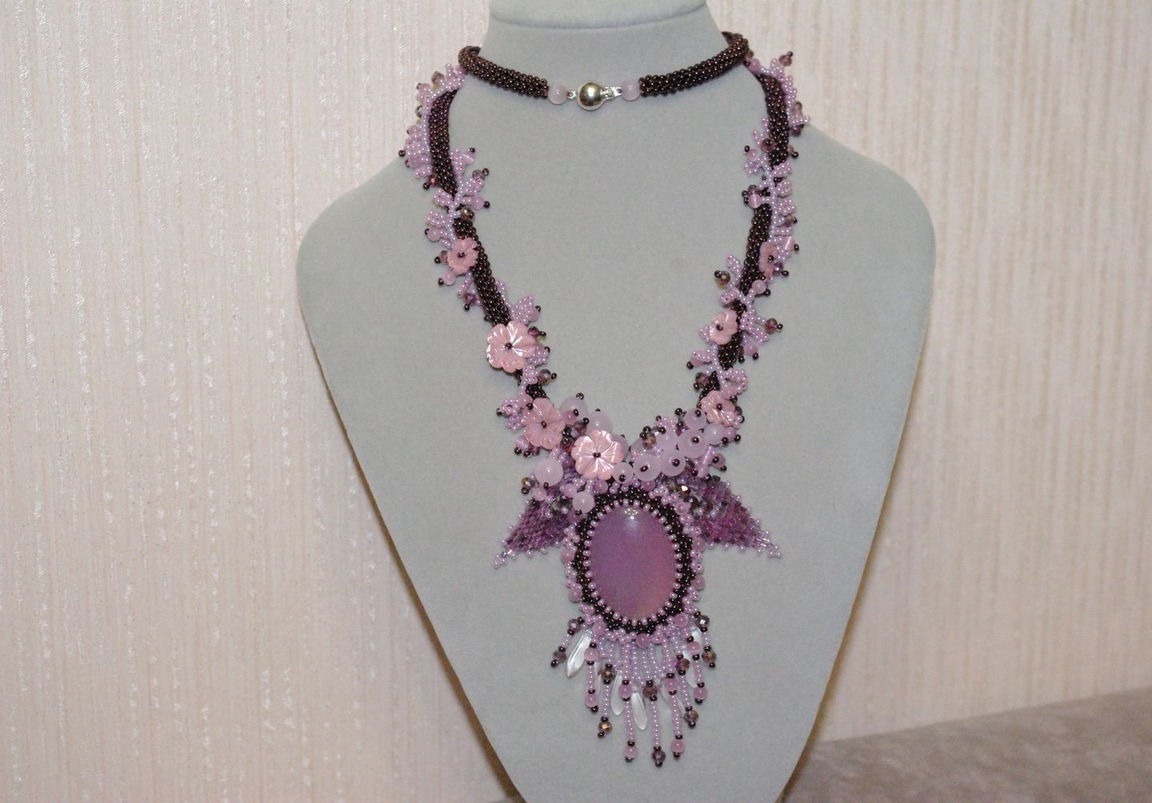 белый, авторская работа, розовый, кулон, коричневый, хендмейд, кулон ручной работы, сиреневый, розовый кварц, бисер чешский, агат тонированный, бисер японский, рубка японская