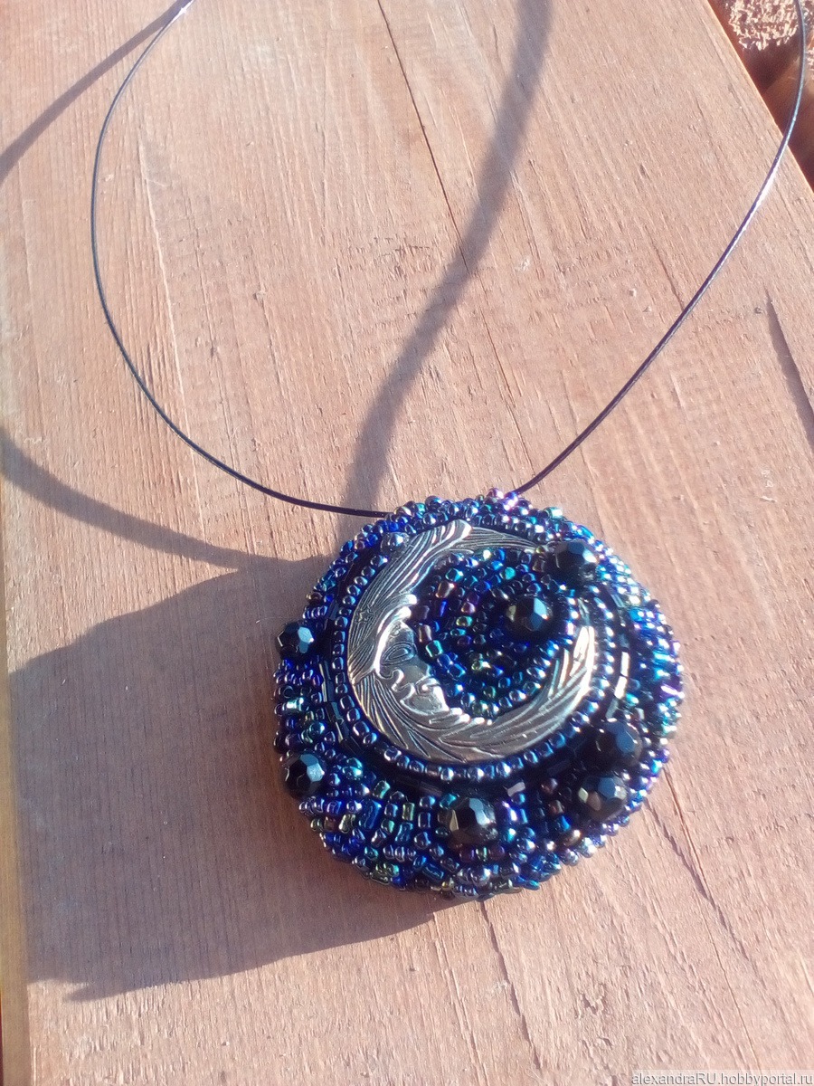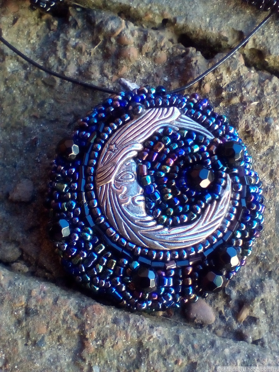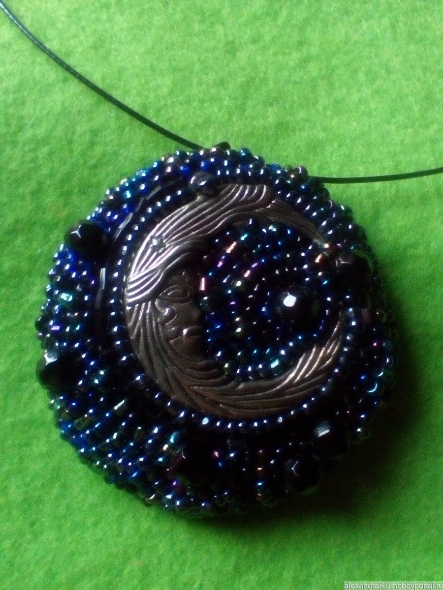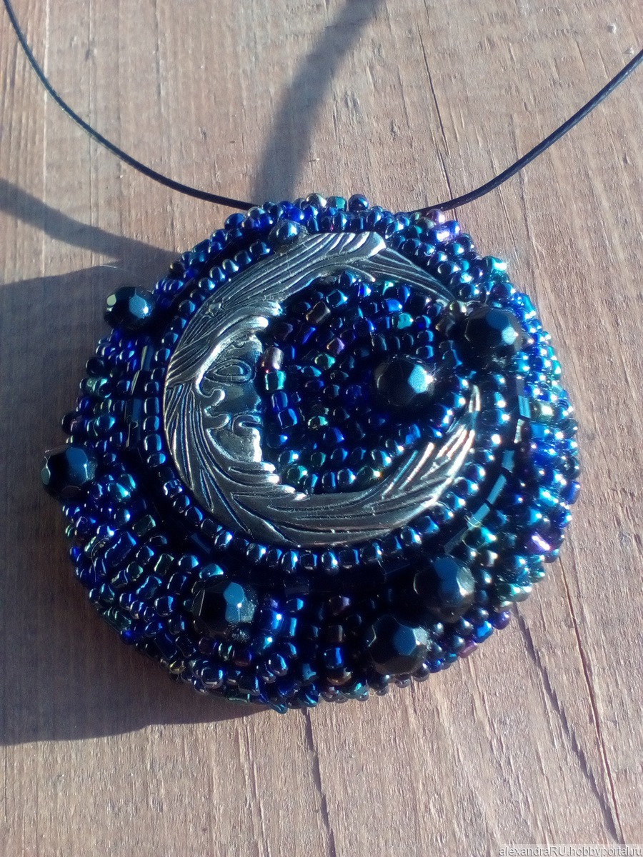 Круглый кулон, вышитый бисером и бусинами, в центре - месяц (металлический элемент). Бисер - черный, синий, гематитовый, цвет бензина (микс), рубка. Изнанка - черная натуральная кожа.