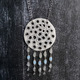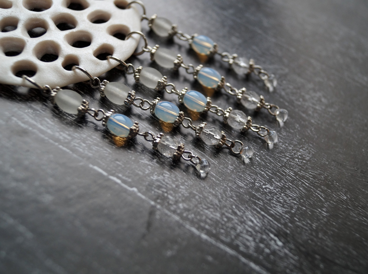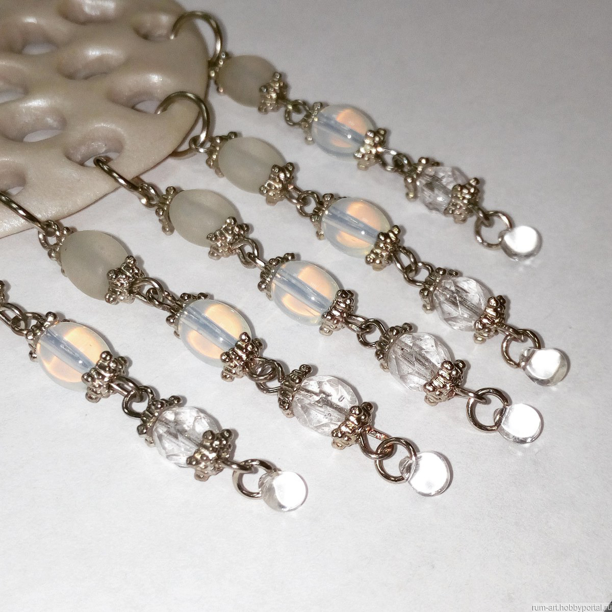 Кулон выполнен из запекаемой полимерной глины. Лицевая сторона тонирована перламутром. На оборотной стороне рельефный рисунок с тонировкой акриловой краской цвета металлик. Внизу кулона пять подвесок из стеклянных, металлических бусин и чешского бисера дропс в форме капель.