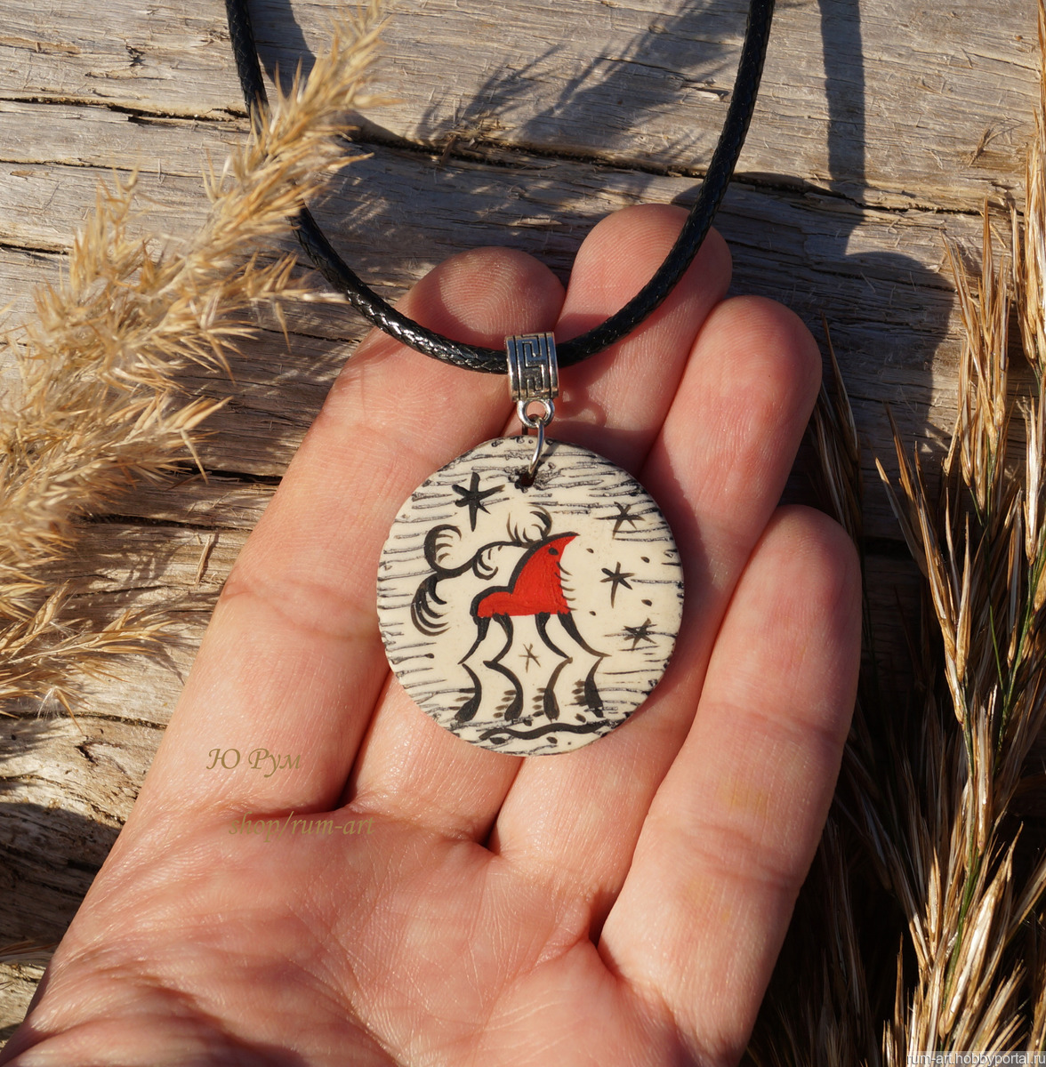 Кулон "Мезенские мотивы. Олень" выполнен из запекаемой полимерной глины в технике имитация кости. Рисунок выполнен акриловыми красками элементами мезенской росписи.