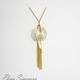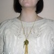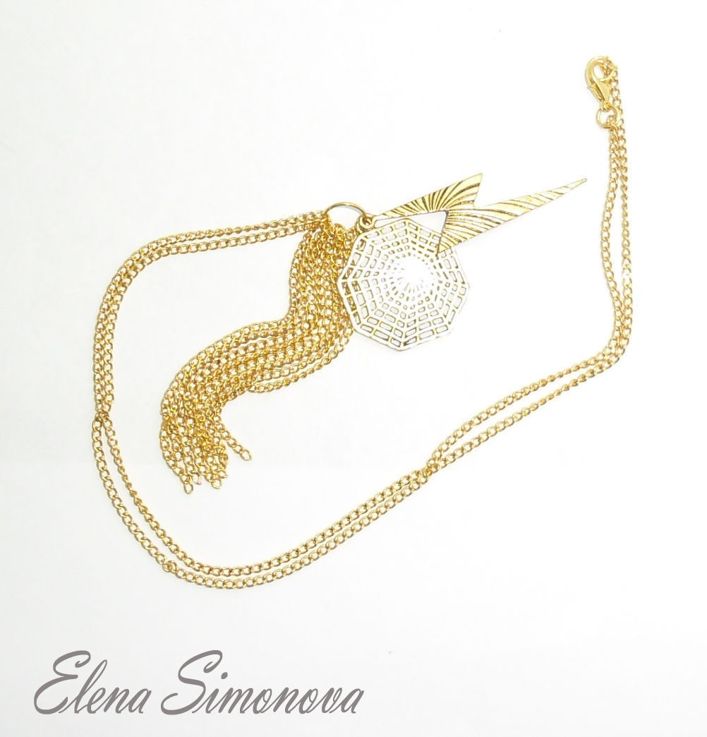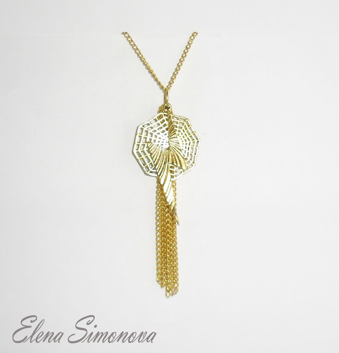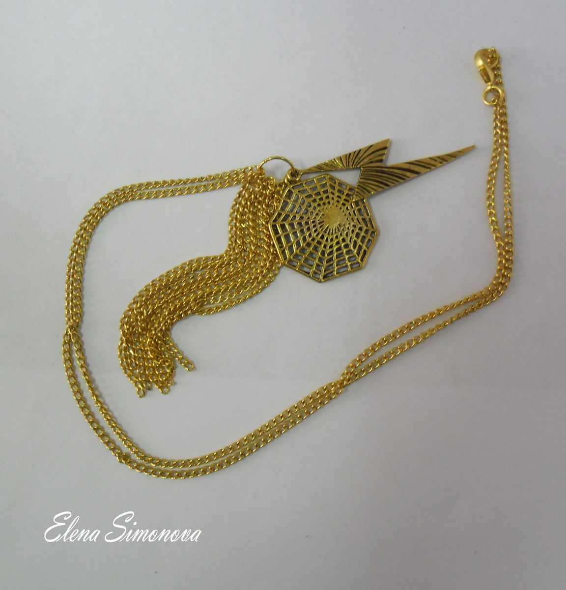 Данный кулон выполнен из 3-х элементов : подвеска Молния ,подвеска Антенна - паутина и Кисточка из цепочек . Подвески навешаны на длинную цепочку с застёжкой карабин. Весь цвет металла -под золото