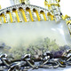 Дендроагат оформлен в необычную объемную оправу. Снизу камень обрамляет растительный орнамент, сверху сказочный город. Город состоит из отдельных домов-башенок и воздушного моста. Башенки объемные, полые внутри со сквозными прорезными окошками.