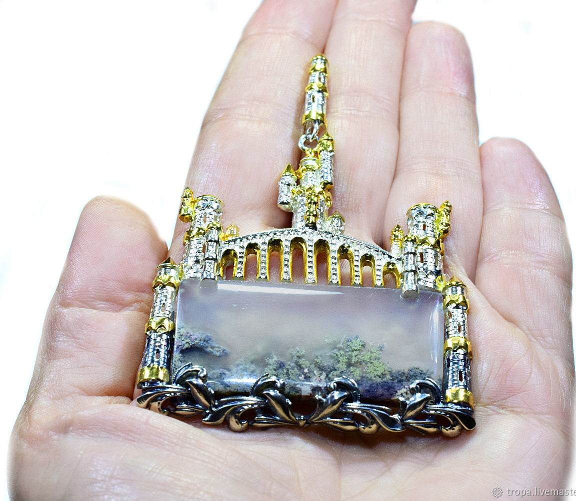 фэнтези, подарок девушке женщине, серебро 925 пробы, кулон с агатом, серебряный кулон, фантастика, сказочный город, сказочный мир, дендроагат, кулон с городом, фантастический город, зазеркалье, серебро с золотом, волшебный город, волшебный мир, иной мир, кулон с дендроагатом, кулон фэнтези, серый с золотым, иномирье