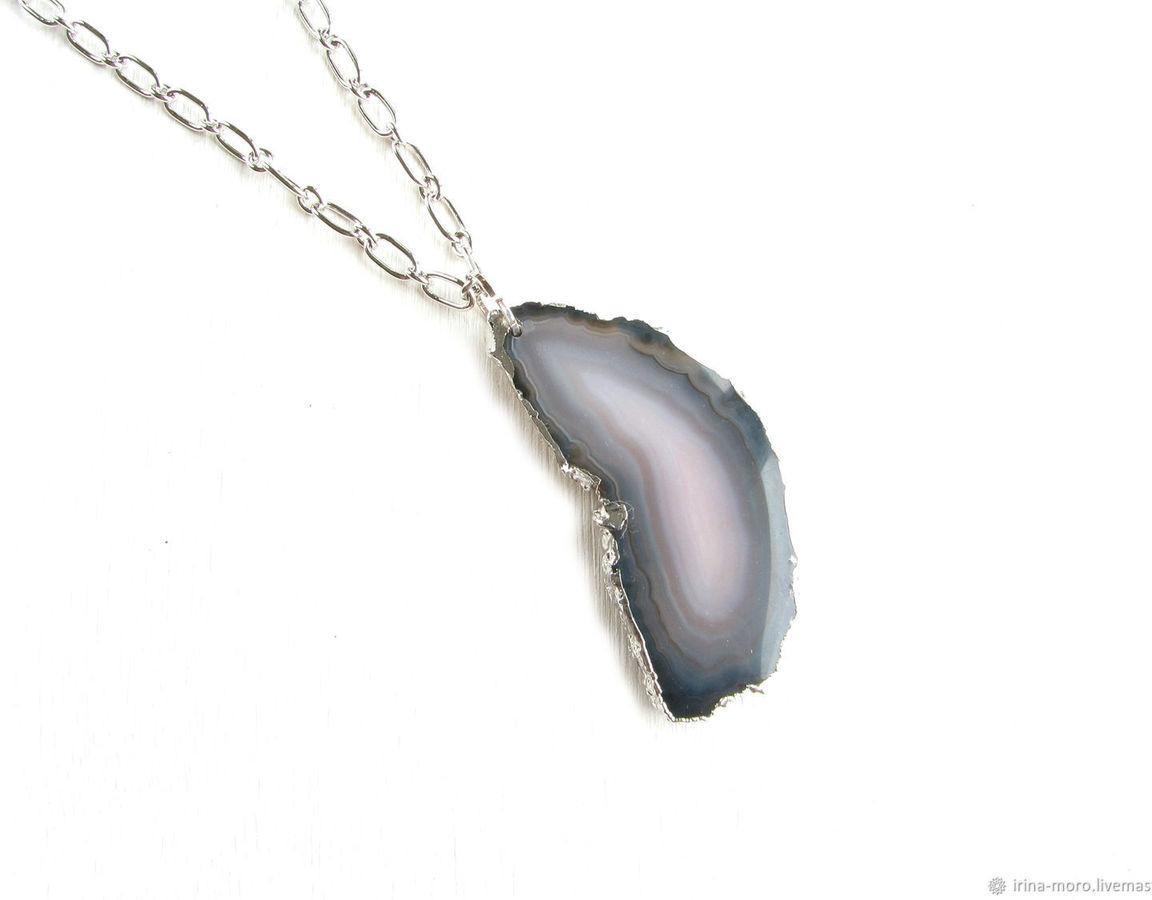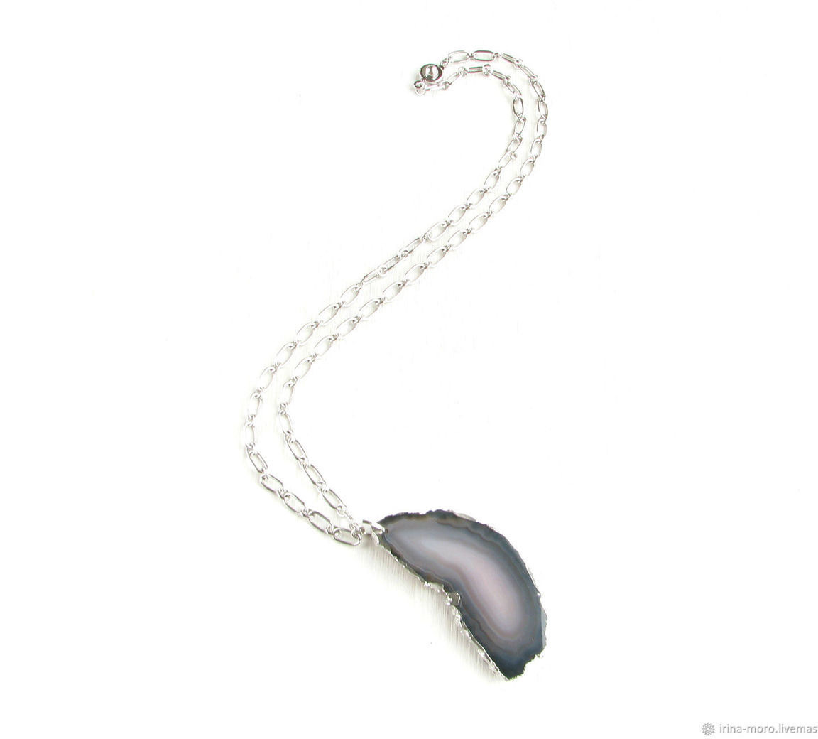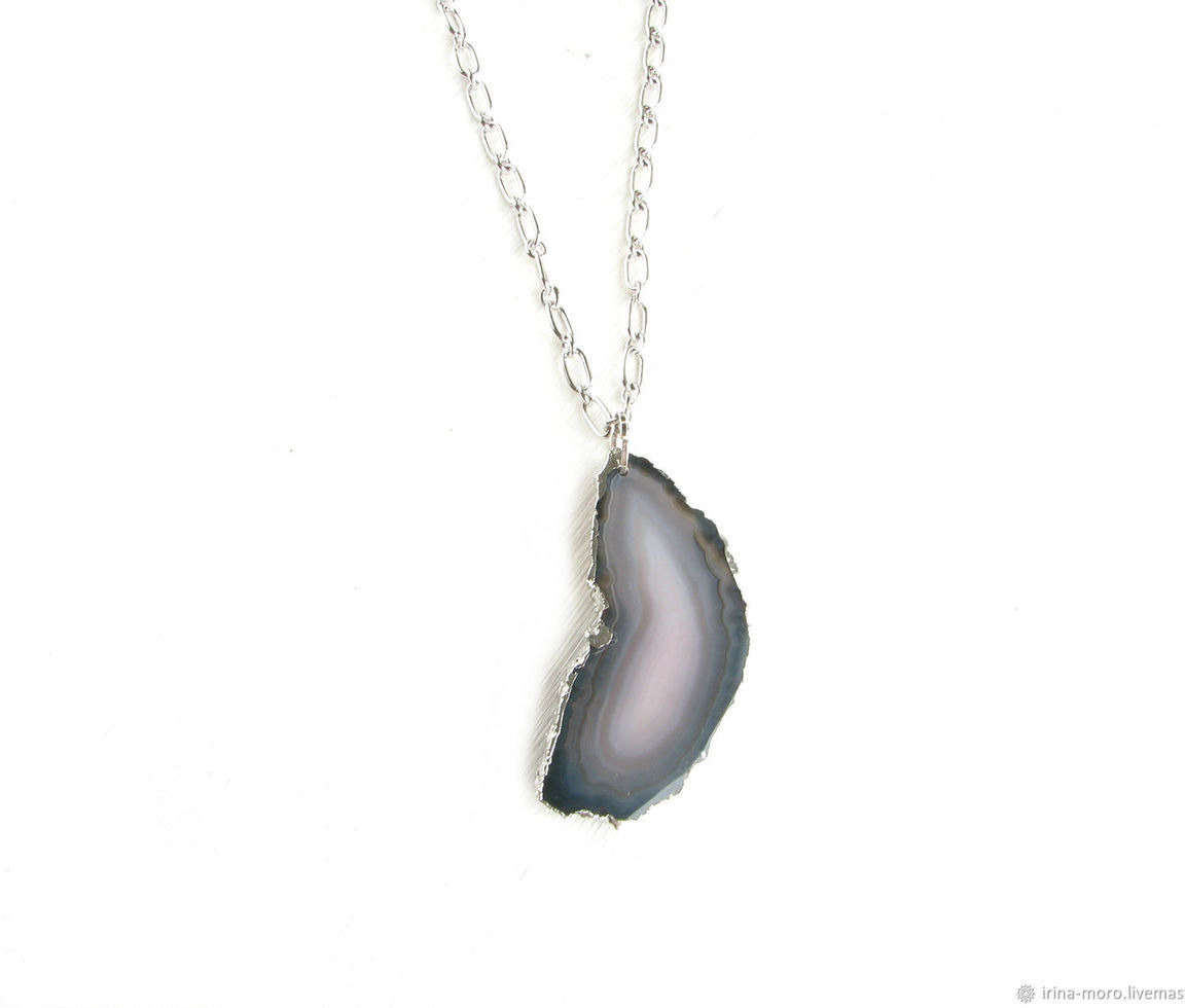 Кулон "Ночь" с красивым срезом черно-серого агата с серебряными краями на серебряной (родиевой) цепочке высокого качества. Размер камня 6 см*2,5 см*0,4 мм. Длина цепочки 50 см. Длину цепочки можно сделать на Ваше усмотрение. Черный кулон сделан из гипоаллергенной родиевой фурнитуры высокого качества (Южная Корея).