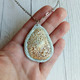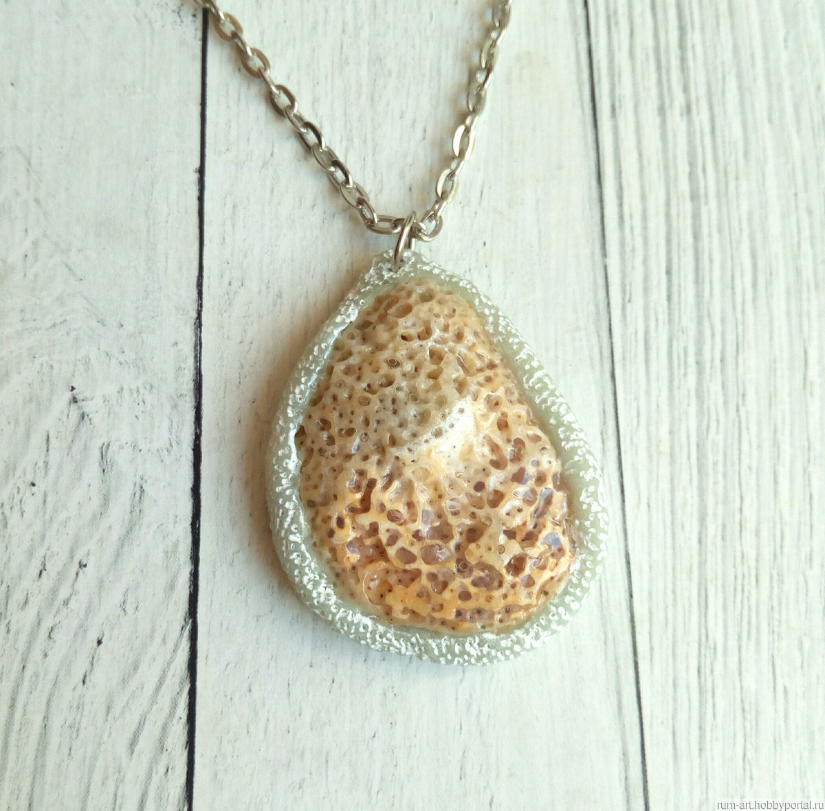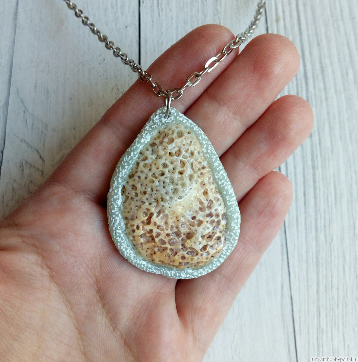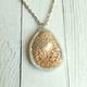 Кулон с морской ракушкой на цепоче. Морская ракушка, бережно баюканая волнами Чёрного моря, открывшими всю внутреннюю красоту и ранимость, надёжно укреплена основой из запекаемой полупрозрачной полимерной глины. Полимерной основе предана шероховатая текстура, затонирована акриловой краской, похожая на обкатанное в морских водах стеклышко. Сверху для большей прочности ракушка покрыта лаком на водной основе, что дополнительно усиливает цвет ракушки и создаёт эффект влажной поверхности.