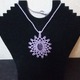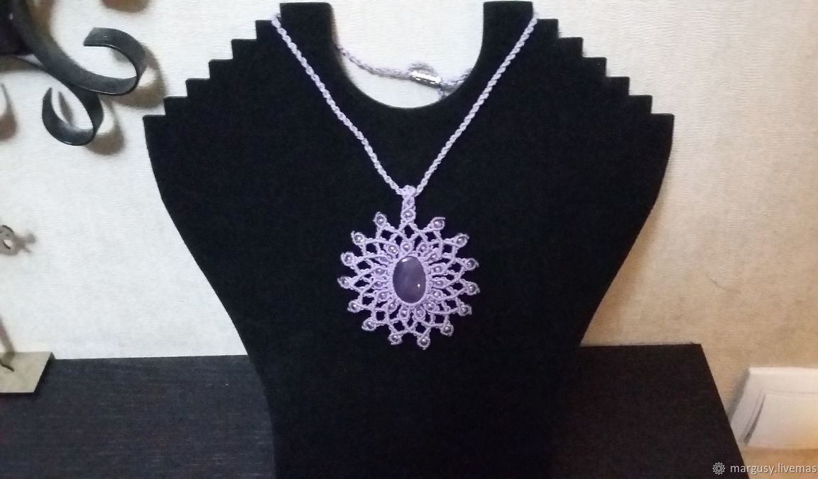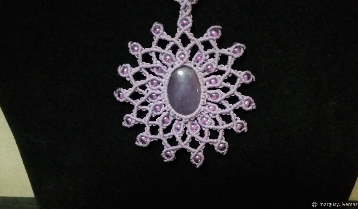 Кулон выполнен в технике макраме из вощеной синтетической нити сиреневого цвета с японским бисером. В центре кулона вплетен кабошон сиреневый стеклянный (имитация аметиста). Размер кабошона - 18х25 мм. Длина кулона регулируется с помощью скользящей металлической трубочки.