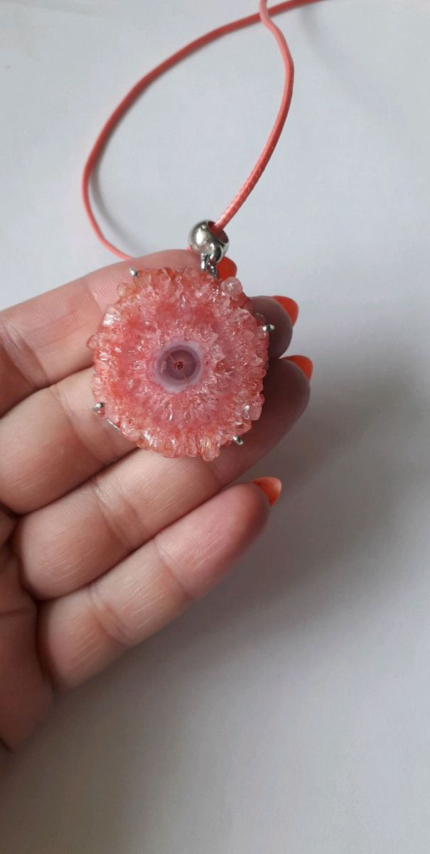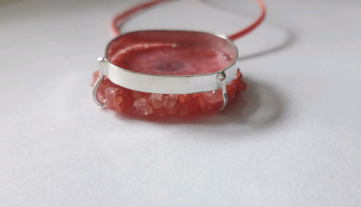 Кулон выполнены из кабошона среза натурального солнечного кварца кораллового цвета (тонирован). Форма камня природная произвольная. Шлифовка камня гладкая.