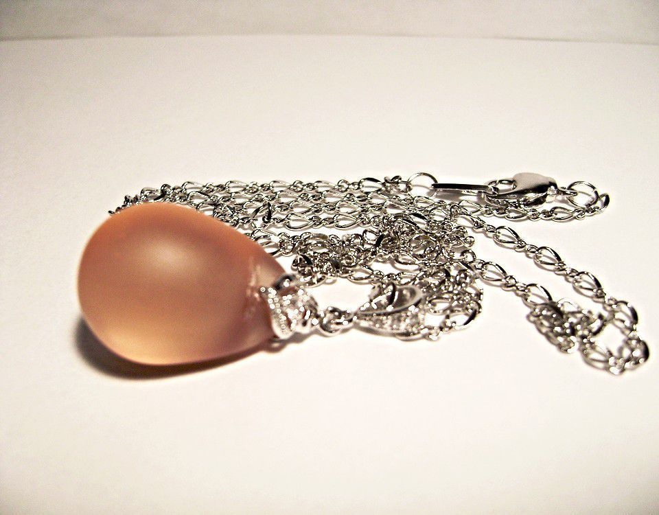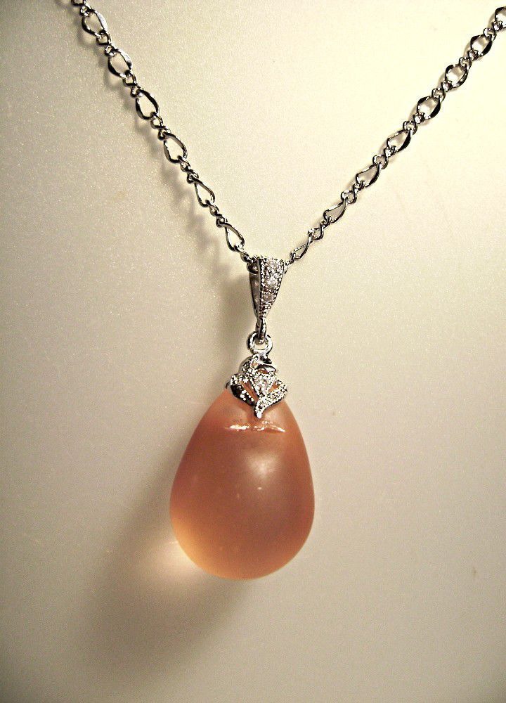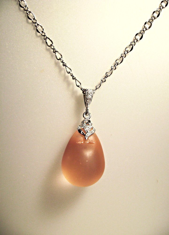 Кулон сделан из родированной фурнитуры с фианитами и крупной бусины-груши 22х15мм из чешского нежно-персикового цвета с матовым эффектом.