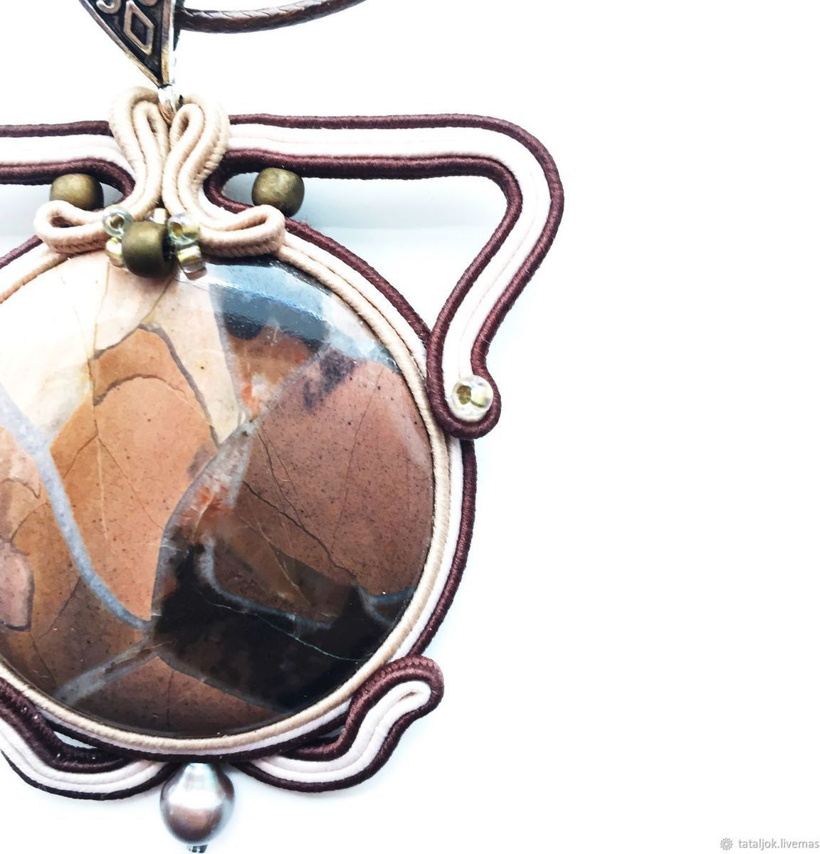 Кулон сутажный, подвеска украшение из натурального камня Осенний пейзаж. Кулон песочного цвета выполнен с кабошоном яшмы необычной расцветки, белорусского сутажа, японскими бусинами и подвеской из жемчуга. Кулон прекрасно подходит для ношения на каждый день. Обратная сторона из натуральной замши.