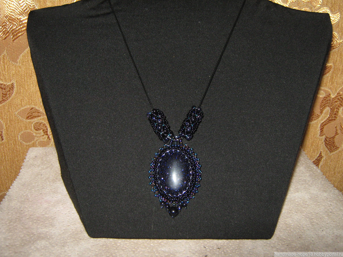 Кулон вышитый, из синего авантюрина и чешского бисера, 5х4 см, в обрамлении двух плетеных бусин (также из синего авантюрина и чешского бисера) на кожаном шнурке.