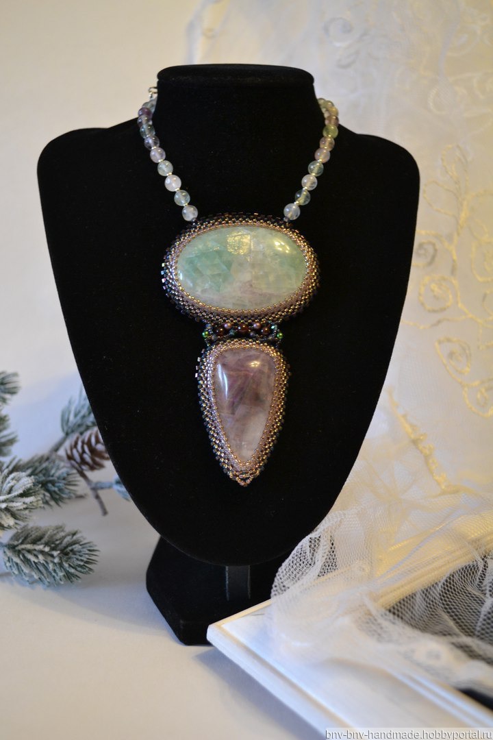 Шикарные кабошоны из флюорита в окружении японского бисера Тохо! Словно два сообщающихся сосуда с неким зельем внутри.Камни очень красивые! Так же в работе жемчуг Сваровски, стеклянные бусины, гранатовые бусины.Бусинная часть собрана на ювелирный тросик.