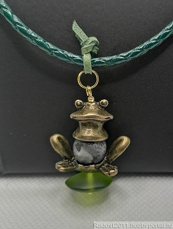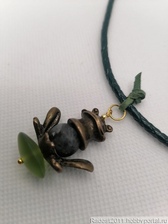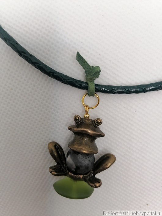 Подвеска Лягушонок фурнитура античная бронза. Животик Лягушонка - матовый лабрадорит. Кувшинка - чешская бусина стекло. Подвеска на натуральном плетеном кожаном шнуре зеленого цвета.