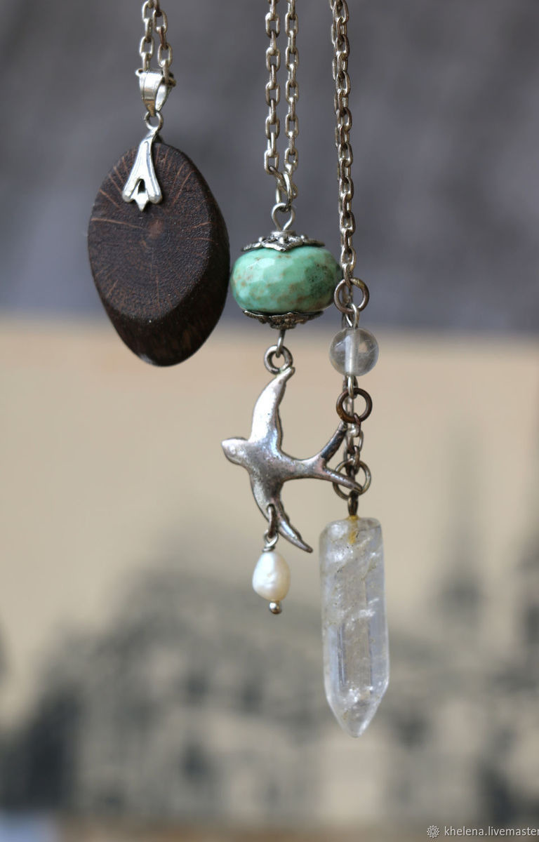 подарок девушке, весеннее настроение, кулон с кварцем, бирюзово-коричневый, весенний подарок, стихия воздуха, стильное украшение на шею, набор подвесок, кулон из дерева, кулон с хризопразом, кулоны в винтажном стиле, Стихия воды, сет легких кулонов, натуральные украшения, кулоны на цепочке, Ресайклинг, кулон с ласточкой, кулоны с камнями, серебристо-жемчужный, хрустально-прозрачный, матовый шоколадный, комплект кулонов винтаж, чердачные кулоны