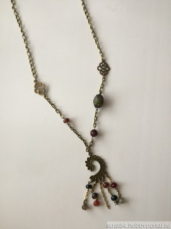Кулон-подвеска с агатами, одна бусина - турмалин.Порой простая латунная подвеска смотрится куда более уместно, нежели самое дорогое бриллиантовое колье. Вовсе не обязательно сочетать дорогую одежду с дорогими украшениями. Наряд не должен кричать о материальном благополучии, он должен ненавязчиво шептать о вашем хорошем вкусе.