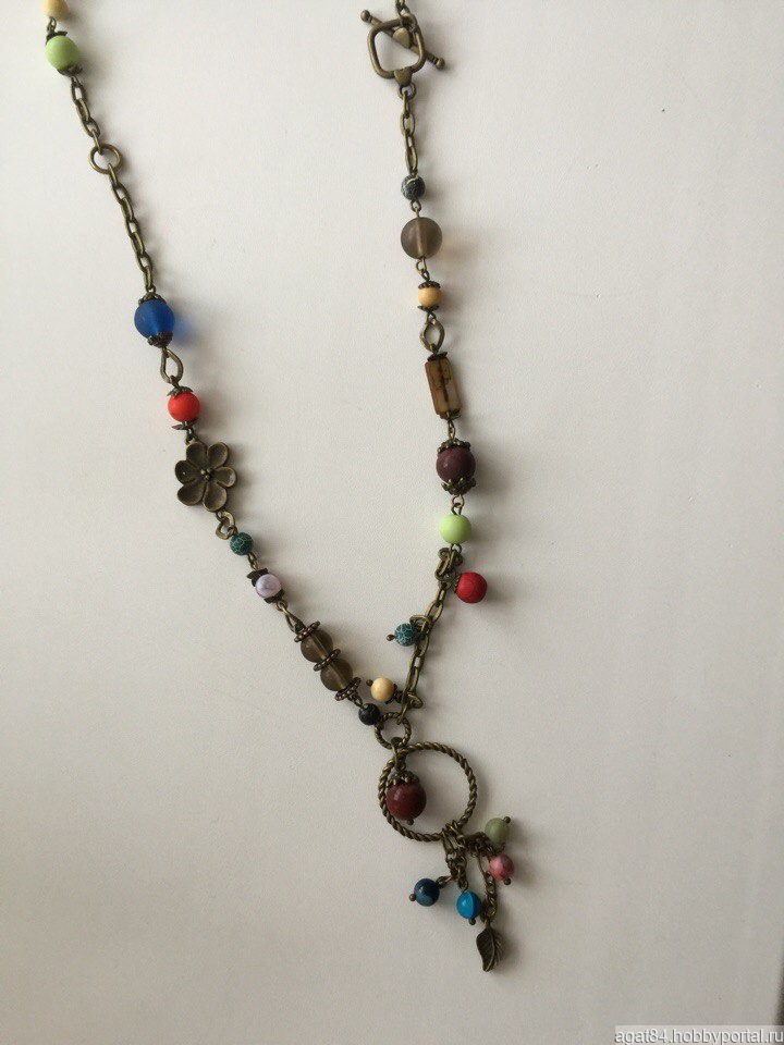 Кулон-подвеска из разноцветных камней, в основном агаты.Порой простая латунная подвеска смотрится куда более уместно, нежели самое дорогое бриллиантовое колье. Вовсе не обязательно сочетать дорогую одежду с дорогими украшениями. Наряд не должен кричать о материальном благополучии, он должен ненавязчиво шептать о вашем хорошем вкусе.