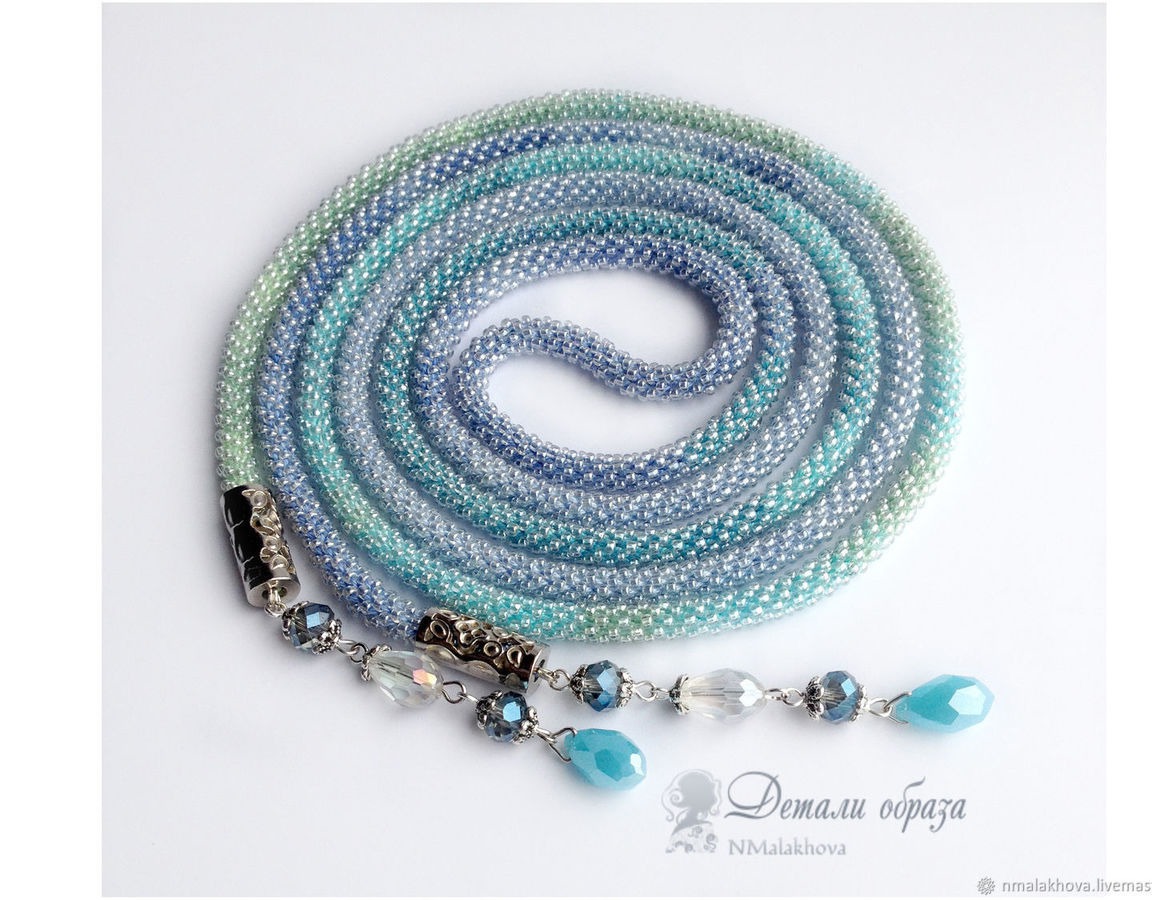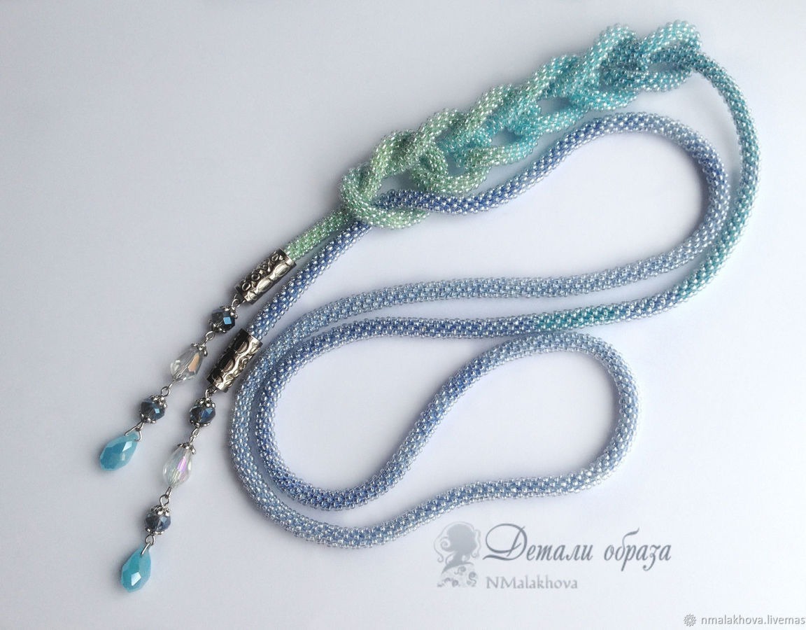 бисер, голубой, лариат, бирюзовый цвет, жгут, лариат из бисера, нежно-зеленый, рондели, бриолеты