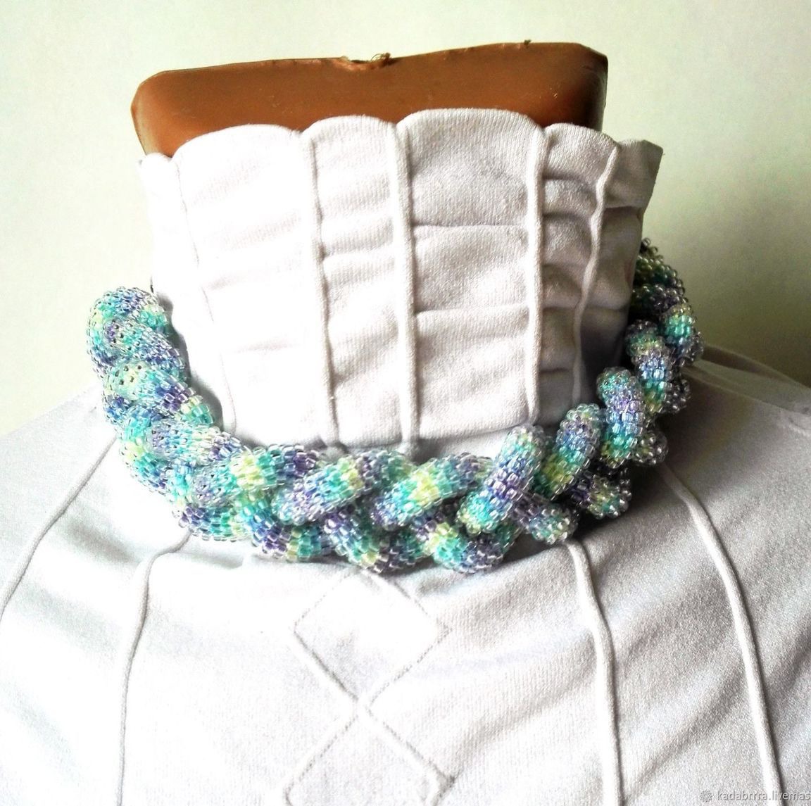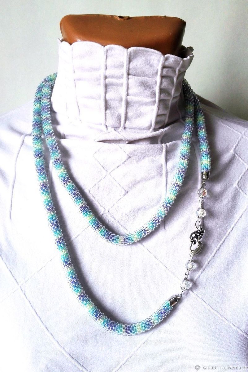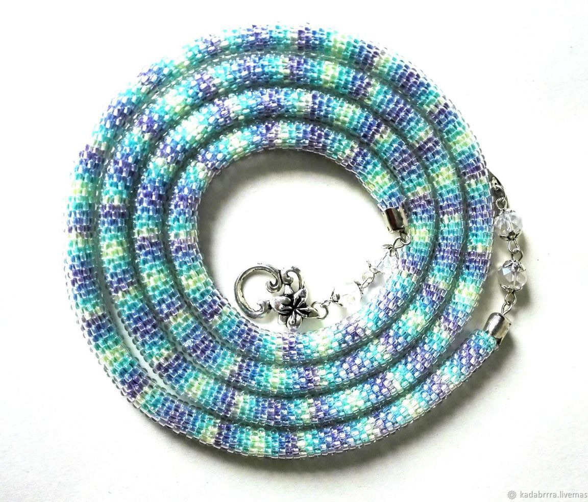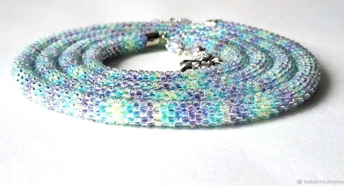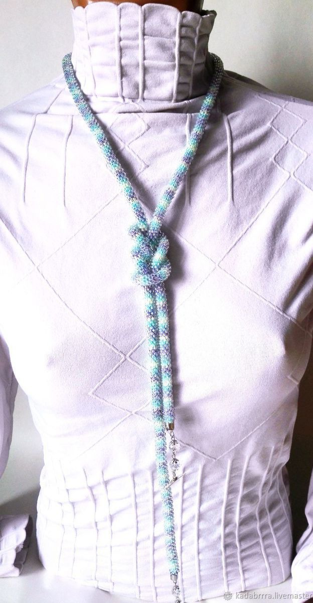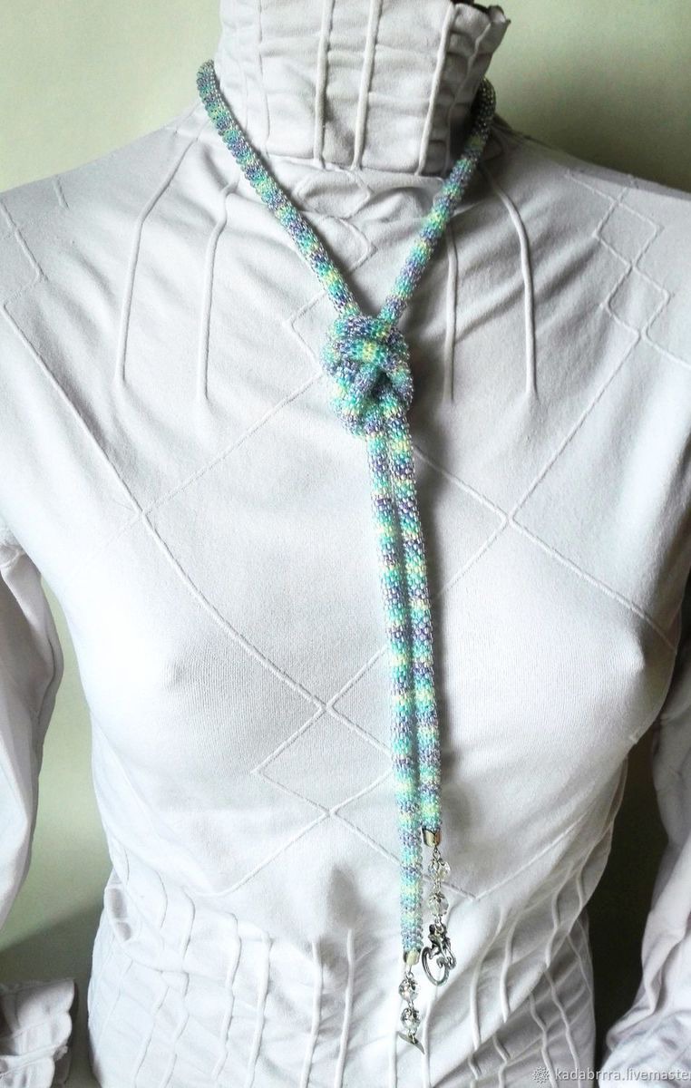 Лариат "Уютный свитерок" связан из блестящего прозрачного чешского бисера на нити секционного крашения, что придает ему такой уютный, но тем не менее стильный вид. Лариат выглядит лаконично, утонченно, нежно, женственно. Концы лариата оформлены прозрачными чешскими бусинами и замочком в форме цветка, что придает ему еще более легкий и воздушный вид.