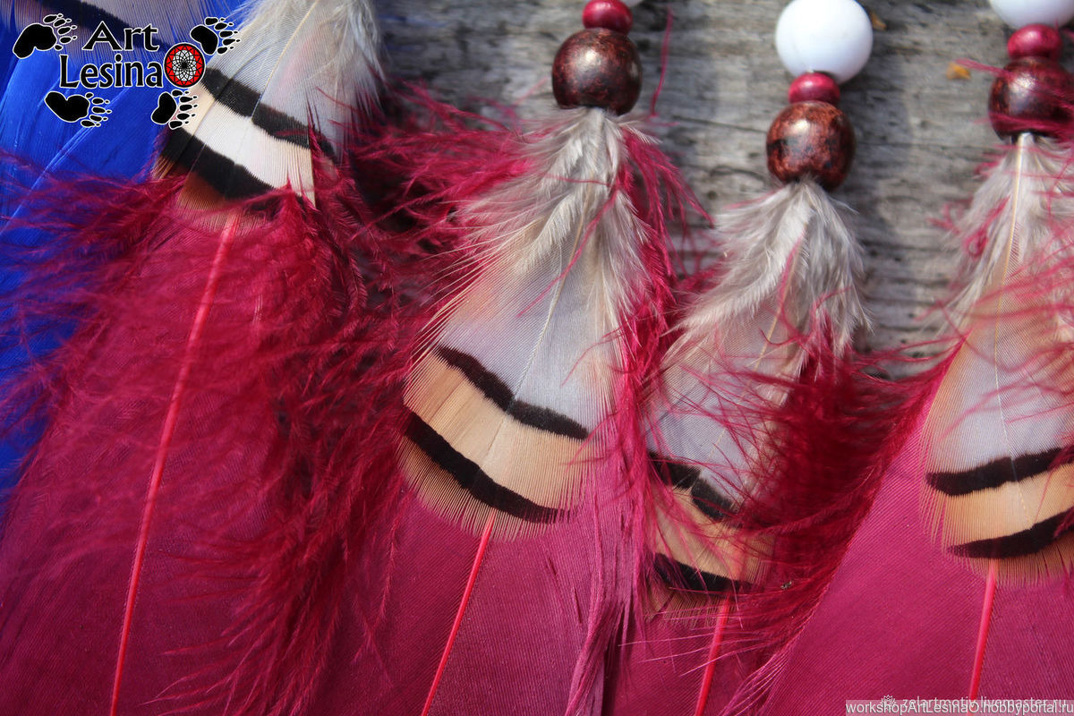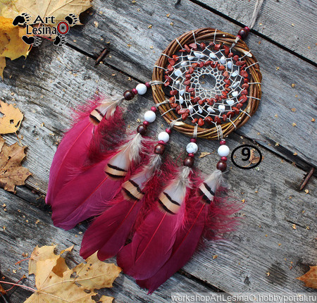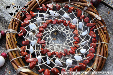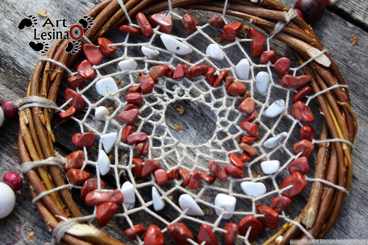 Ловец снов на обруче из ивы с красной яшмой и кахалонгом.
