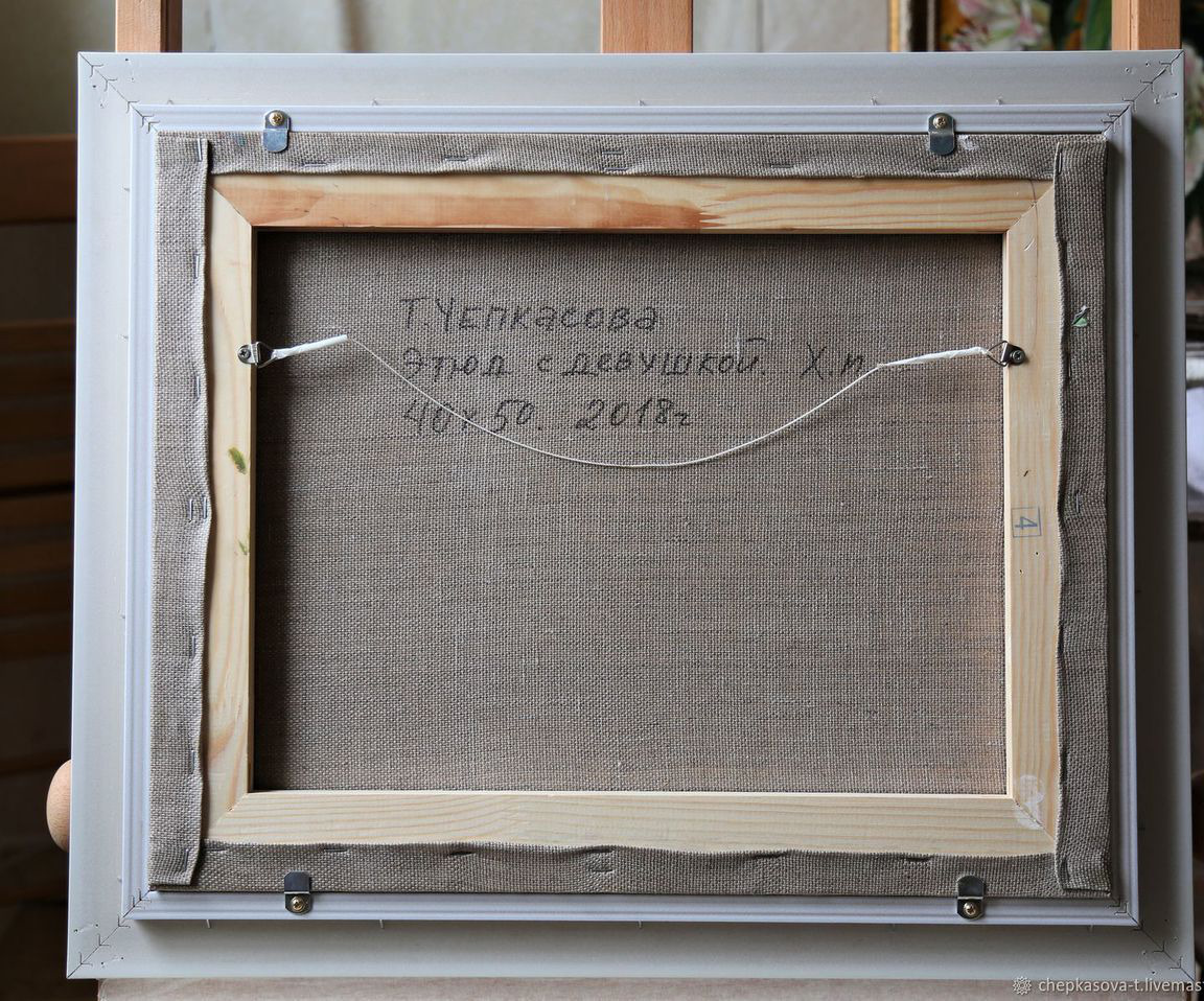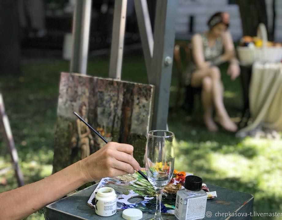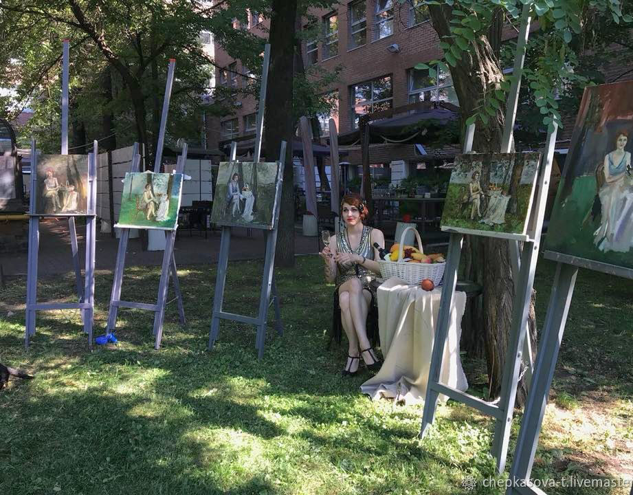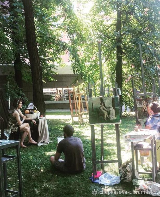 Картина с девушкой за столиком в летнем кафе, с пленэра в арт-кафе "Рукав". 2018 г. Написан в пастозной импрессионистической манере.