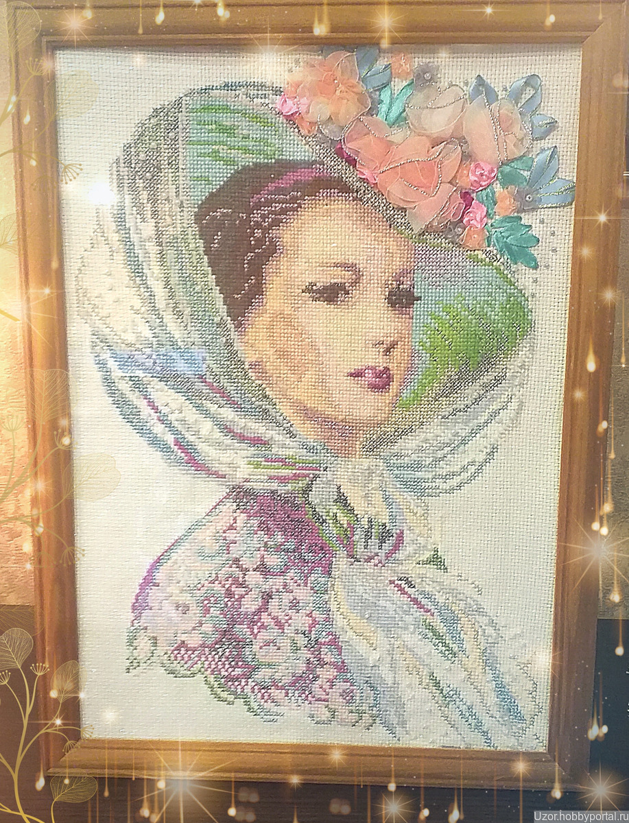 Картина вышита крестиком с добавлением бусин и ленточек.