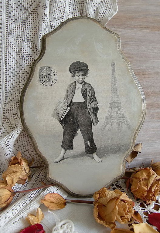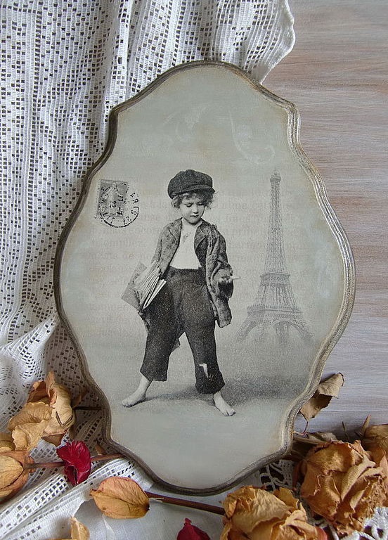 серый, белый, интерьер, панно, винтаж, подарок, картина, панно на стену, ретро, мальчик, париж, панно декупаж, в технике декупаж, панно ручной работы, декупаж панно, панно для прихожей, деревянное панно, для интерьра, в стиле ретро, гаврош