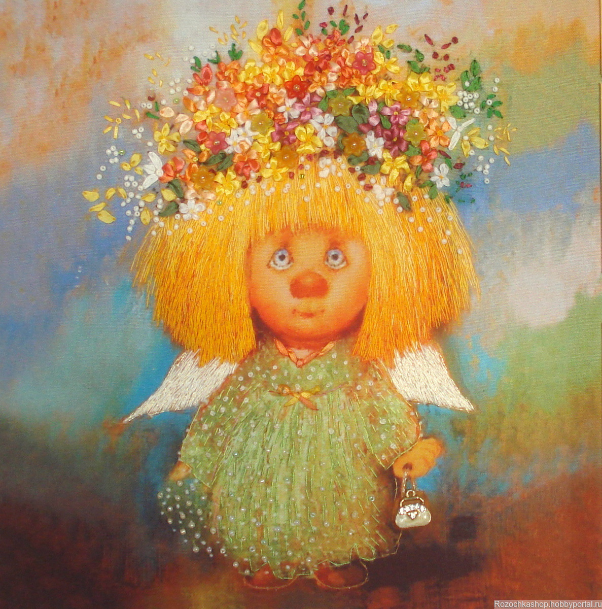 Чудесный ангелочек с сумочкой вышит нитками мулине, шелковыми лентами, бисером. Добавлено немного пластиковых цветочков.