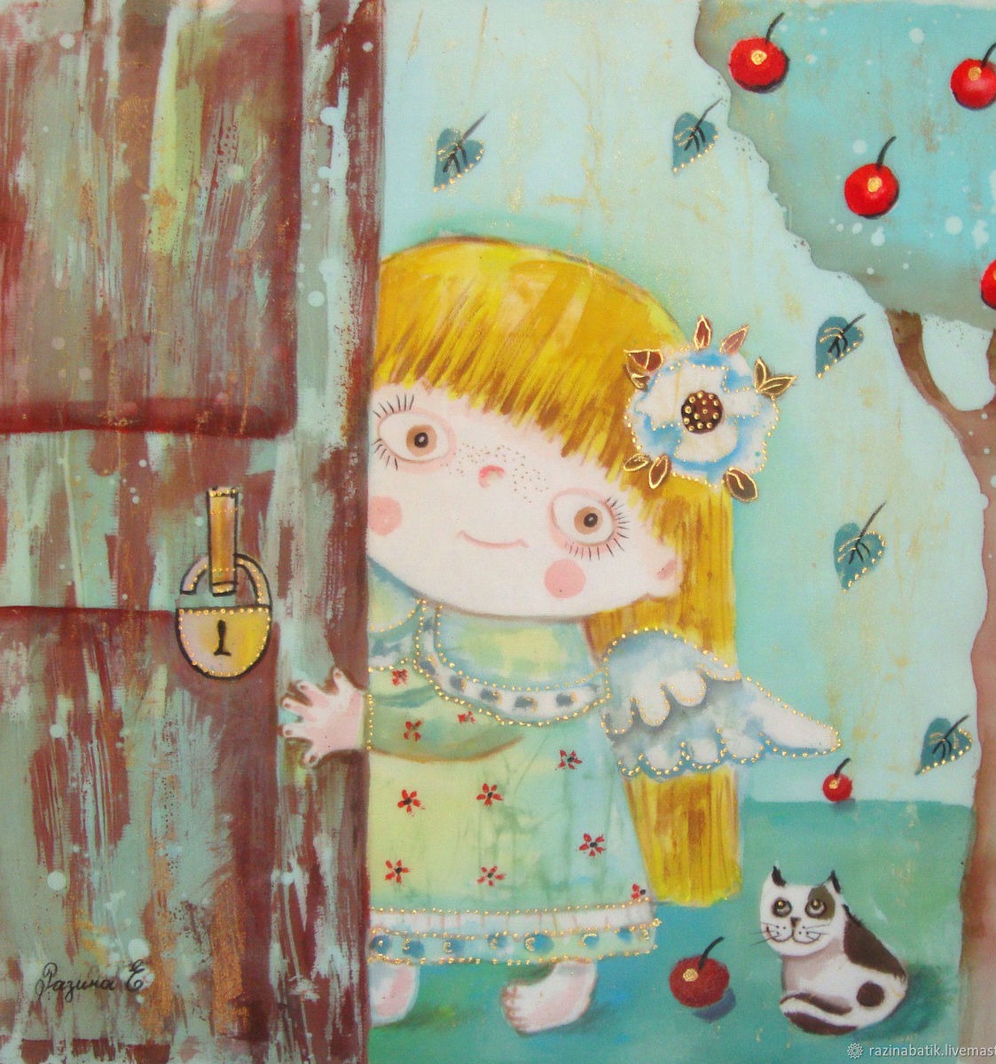дерево, интерьер, дверь, кот, мятный, панно, подарок, стиль, картина, счастье, ангел, девочка, замок, ребёнок, батик