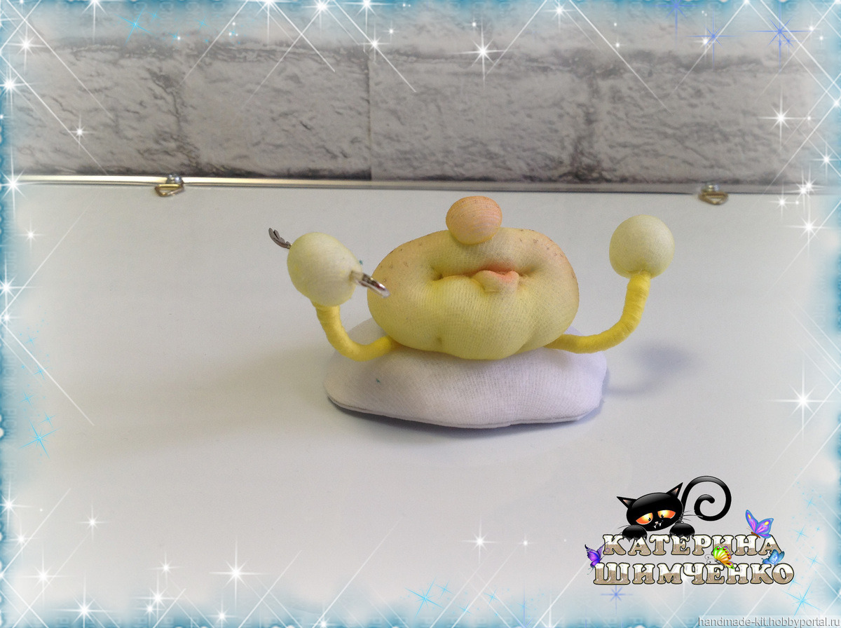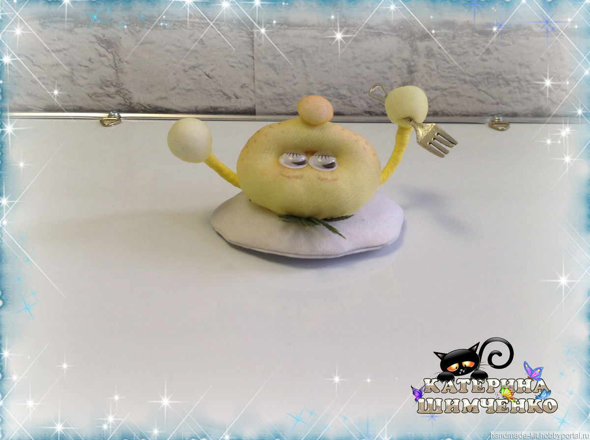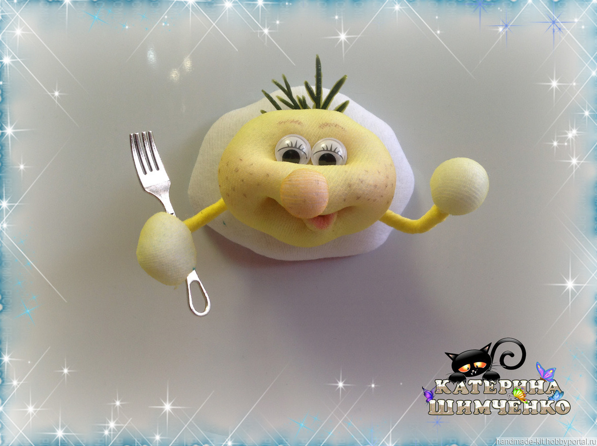 За счёт проволочного каркаса ручкам можно придавать любой изгиб. В руки яишенке можно вложить цветок или карточку с веселой надписью.