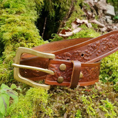 Женский кожаный ремень с латунной пряжкой с тиснением дубовых листьев