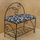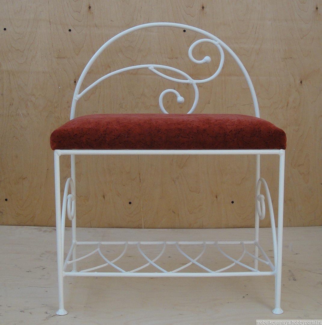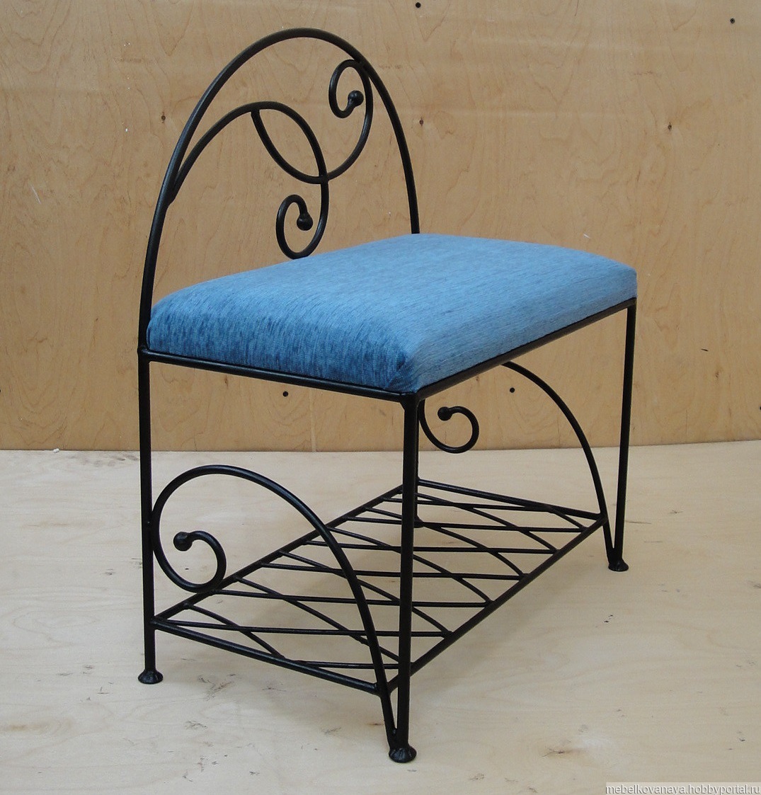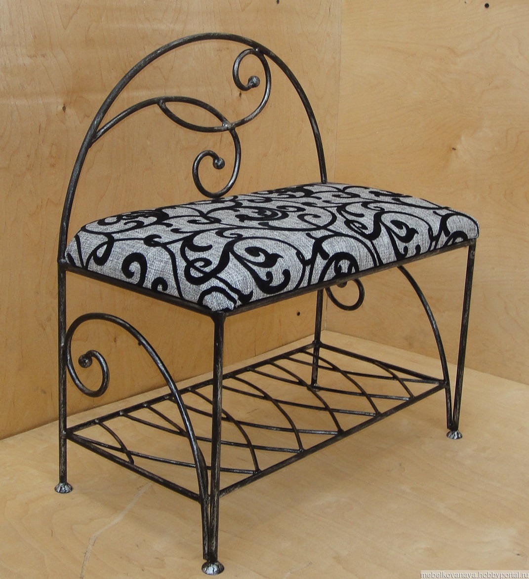 Кованая банкетка Лилии - красивый и удобный диванчик для прихожей. Кроме мягкого сиденья оснащён полкой для обуви.Возможен выбор окраски металлических частей (белый, черный, коричневый), а также нанесение патины (искусственное состаривание) на любой из этих цветов. Обивка банкетки может быть из мебельной ткани или искусственной кожи. Возможно изготовление по другим размерам.