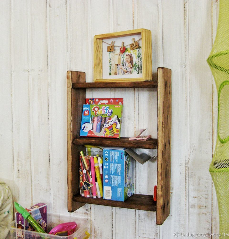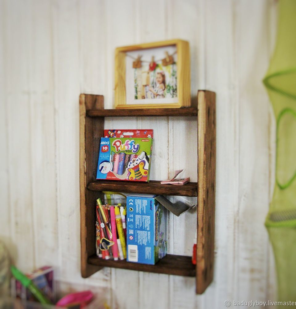 Полку можно разместить и детской комнате, поставить туда фломастеры и небольшие книжки и блокнотики)