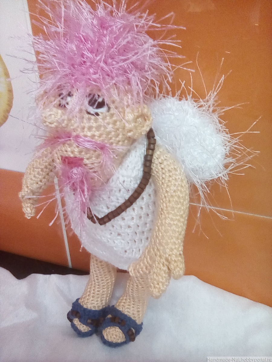 Купидончик,выполнен в технике амигуруми,на шее деревянные бусики,пряжа нарцисс,внутри наполнитель для игрушек